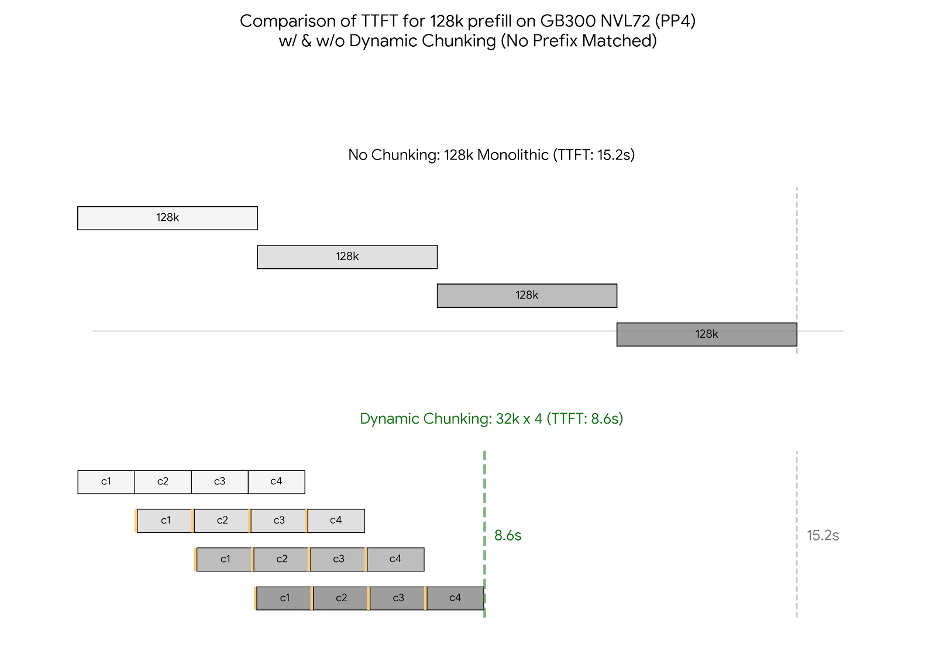 For long-context inference (e.g., 128K tokens), TTFT is a primary constraint especially when little or no prefix matched, and the improvement of TTFT is critical. We address this with Chunked Pipeline Parallelism (PP) for the prefill path combined with Dynamic Chunking, which distributes prompt computation and improves overlap between pipeline stages.