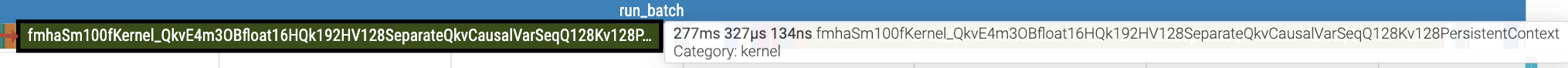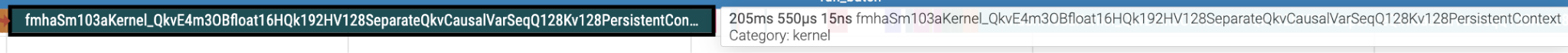 | GB200 | fmhaSm100fKernel_QkvE4m3OBfloat16HQk192HV128SeparateQkvCausalVarSeqqQ128Kv128PersistentContext | 277ms |