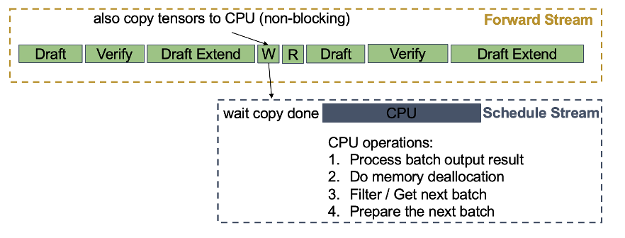 To be specific, Spec-V2 adopts a two-stream design: a forward stream for all the GPU computation, and a schedule stream (here we use term “stream” to emphasize asynchronicity) for CPU operations including result processing, memory deallocation, preparation for the next batch and so on.