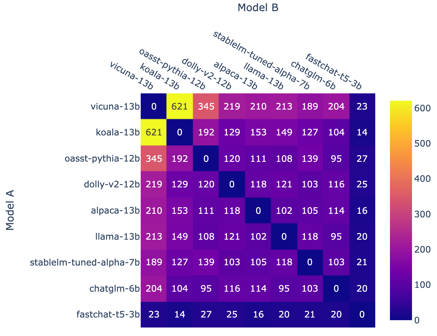Figure 2 shows the battles count of each combination of models. When we initially launched the tournament, we had prior information on the likely ranking based on our benchmarks and chose to pair models according to this ranking. We gave preference to what we believed would be strong pairings based on this ranking. However, we later switched to uniform sampling to get better overall coverage of the rankings. Towards the end of the tournament, we also introduced a new model fastchat-t5-3b. All of these result in non-uniform model frequency.