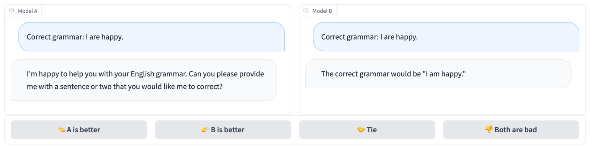 We hosted the arena at https://lmarena.ai with our multi-model serving system, FastChat. When a user enters the arena, they can chat with two anonymous models side-by-side, as shown in Figure 1. After getting responses from the two models, users can continue chatting or vote for the model they think is better. Once a vote is submitted, the model names will be revealed. Users can continue chatting or restart a new battle with two new randomly chosen anonymous models. The platform logs all user interactions. In our analysis, we only use the votes when the model names are hidden.