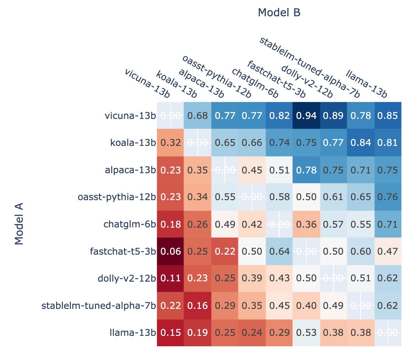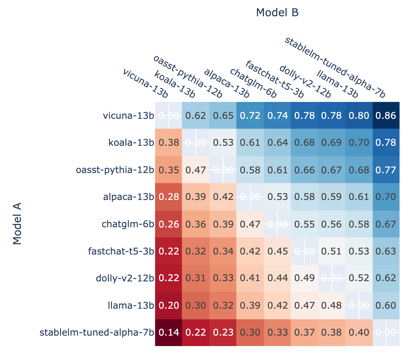 Figure 4: Fraction of Model A wins for all non-tied A vs. B battles.