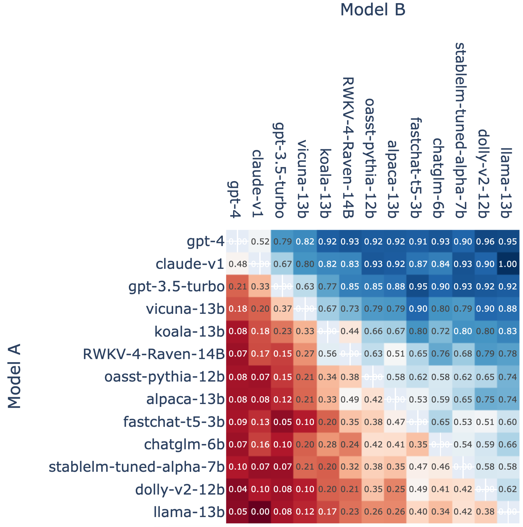 Figure 3: Fraction of Model A Wins for All Non-tied A vs. B Battles.