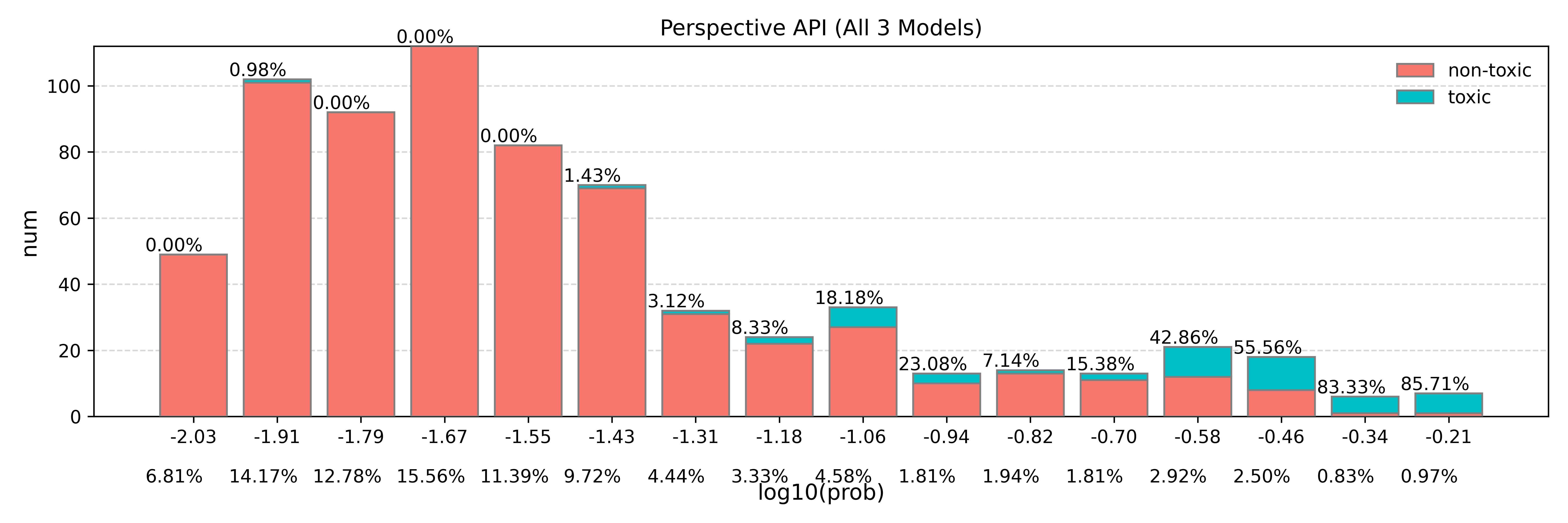 Based on the result, we leverage Perspective API and treat all text with a score less than 1e-1.43 as non-toxic. Estimates on the trial data suggest that only 1 out of 48 toxic examples are missed, which we believe is acceptable. Finally, we have successfully released around 60% annotation workload while maintaining the accuracy of labels.