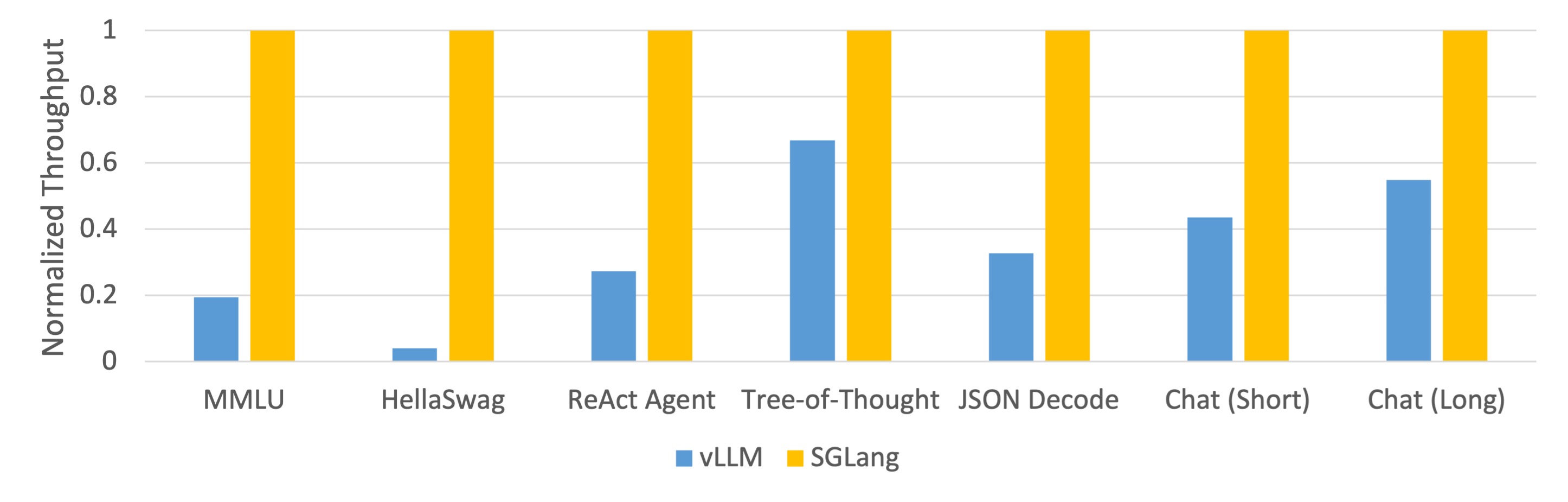 We use SGLang to implement common LLM workloads, including agent, reasoning, extraction, chat, and few-shot learning tasks, employing the Llama-7B and Mixtral-8x7B models on NVIDIA A10G GPUs. Figures 1 and 2 below demonstrate that SGLang achieves up to 5 times higher throughput compared to existing systems, namely Guidance and vLLM. We have released the code and a tech report.