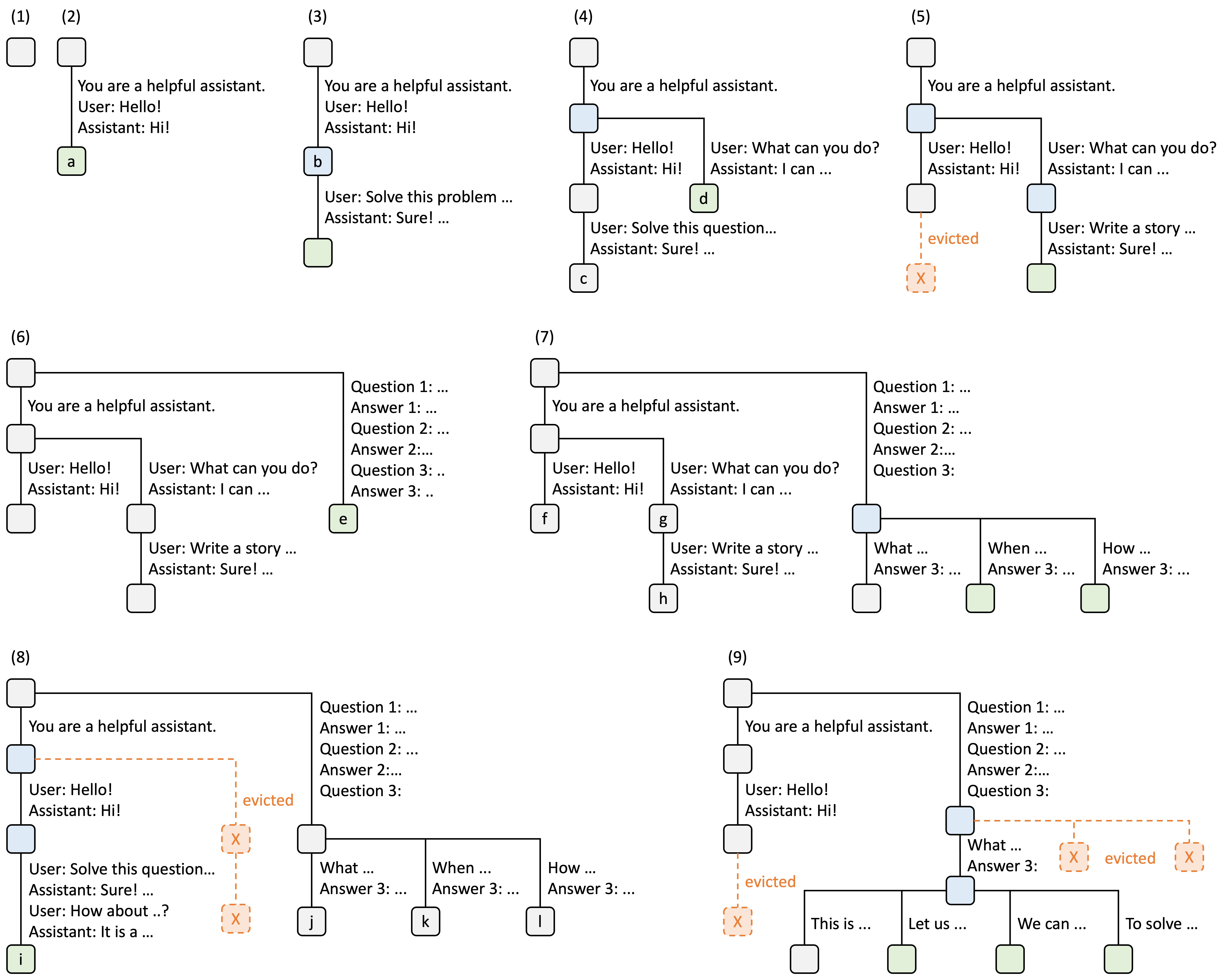 Figure 4. Examples of RadixAttention operations with an LRU eviction policy, illustrated across nine steps.