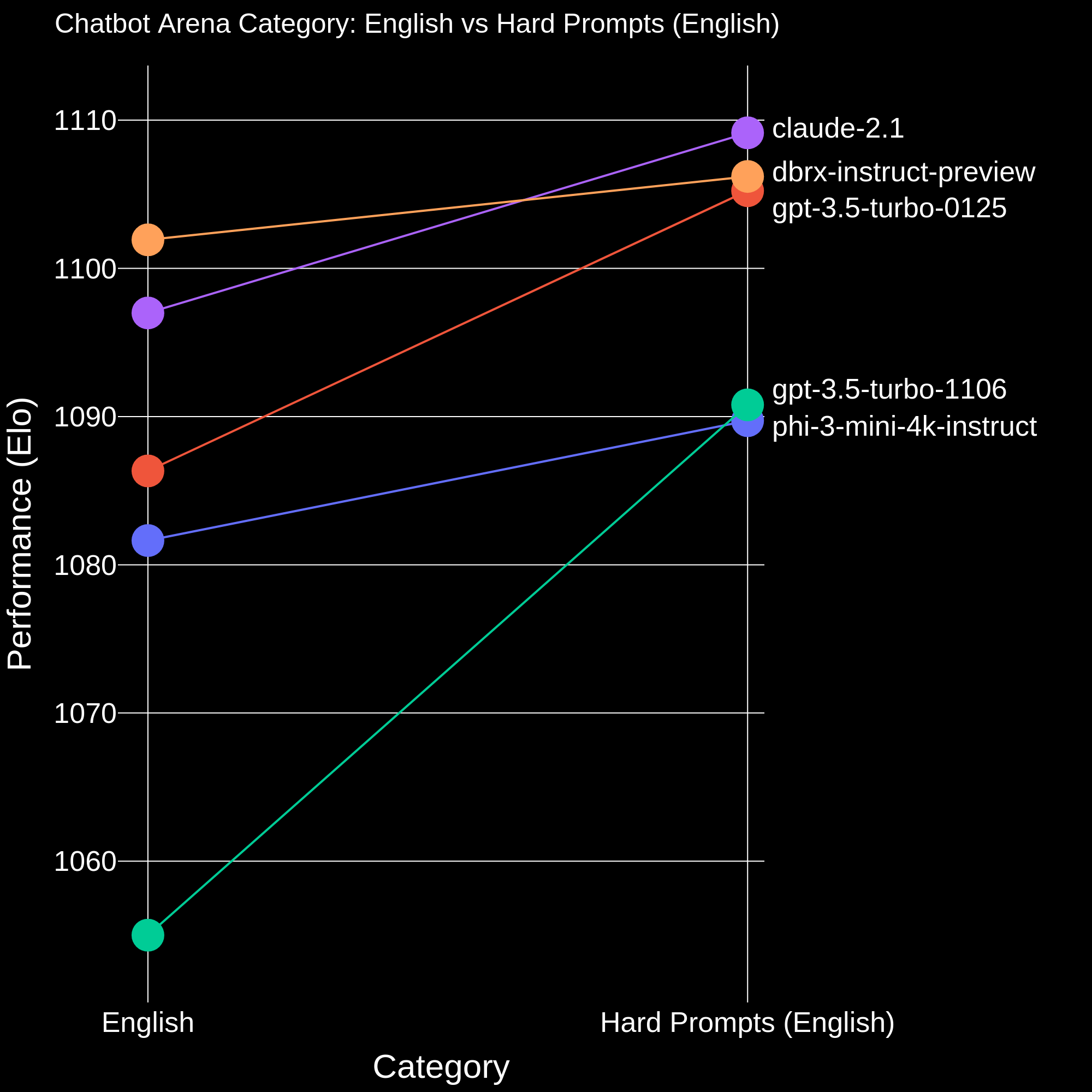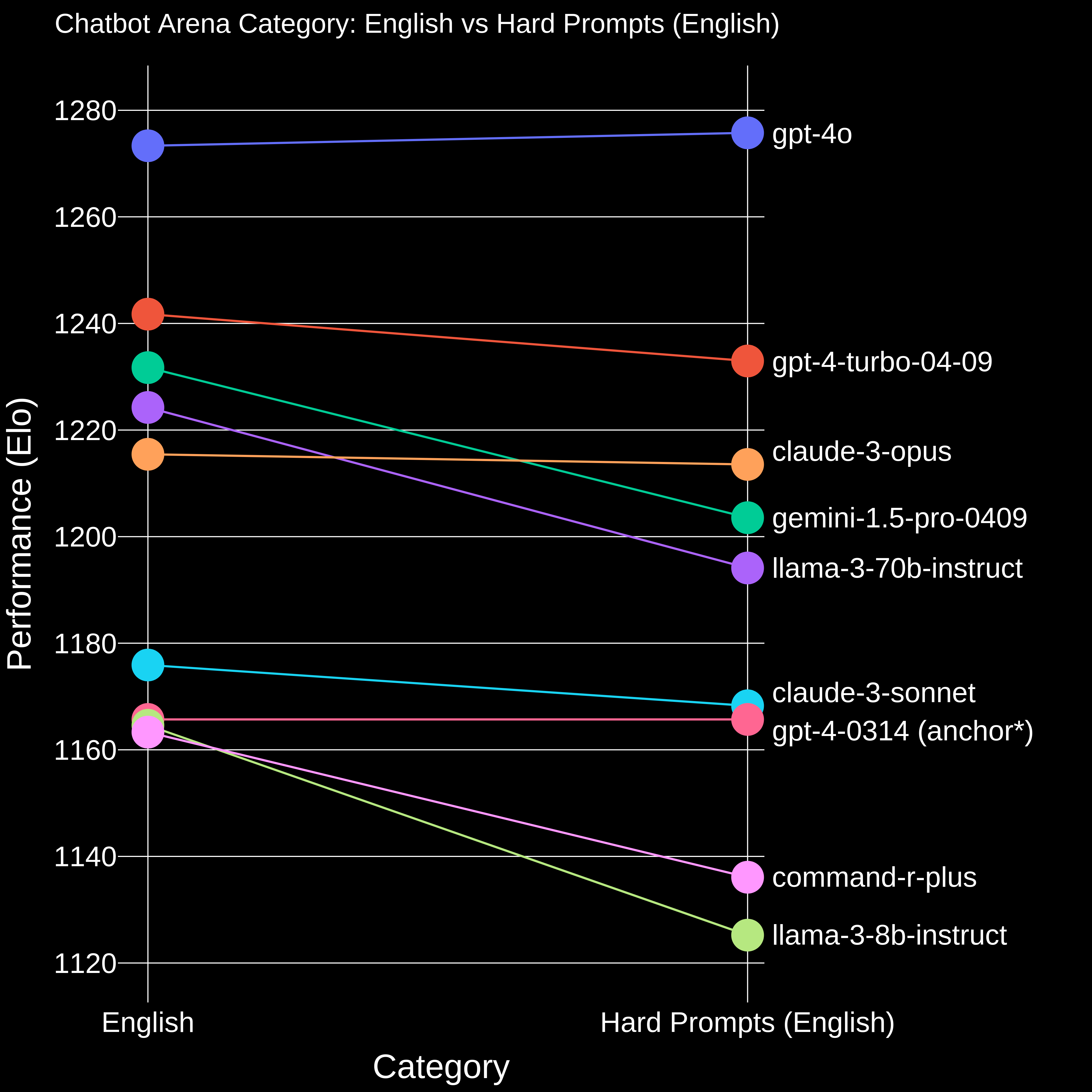 Figure 1. Comparison between Chatbot Arena Category English vs Hard Prompts (English). We set gpt-4-0314 as anchor model.