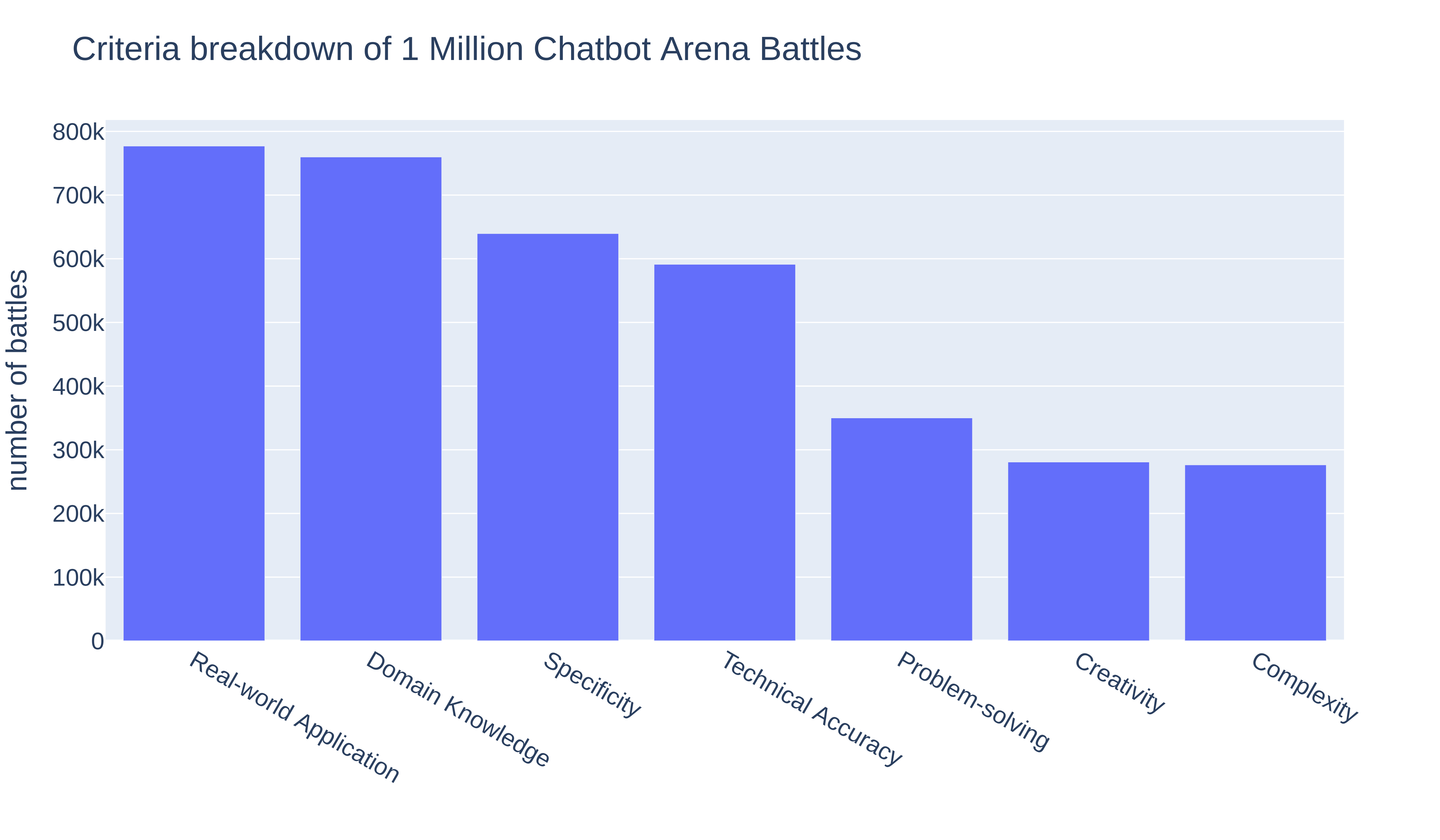 We employ Meta's Llama-3-70B-Instruct to help us label over 1 million Arena prompts on whether certain critieria are met. Note that we do not use LLM as judges to evalute model answers. We use the preference votes casted by Arena users to rank models. Figure 3 shows the criteria breakdown (i.e., how many prompts satisfy each criteria). We observe the most common criteria are Specificity, Domain Knowledge, and Real-world Application, while the relatively rare criteria are Problem-Solving and Complexity.