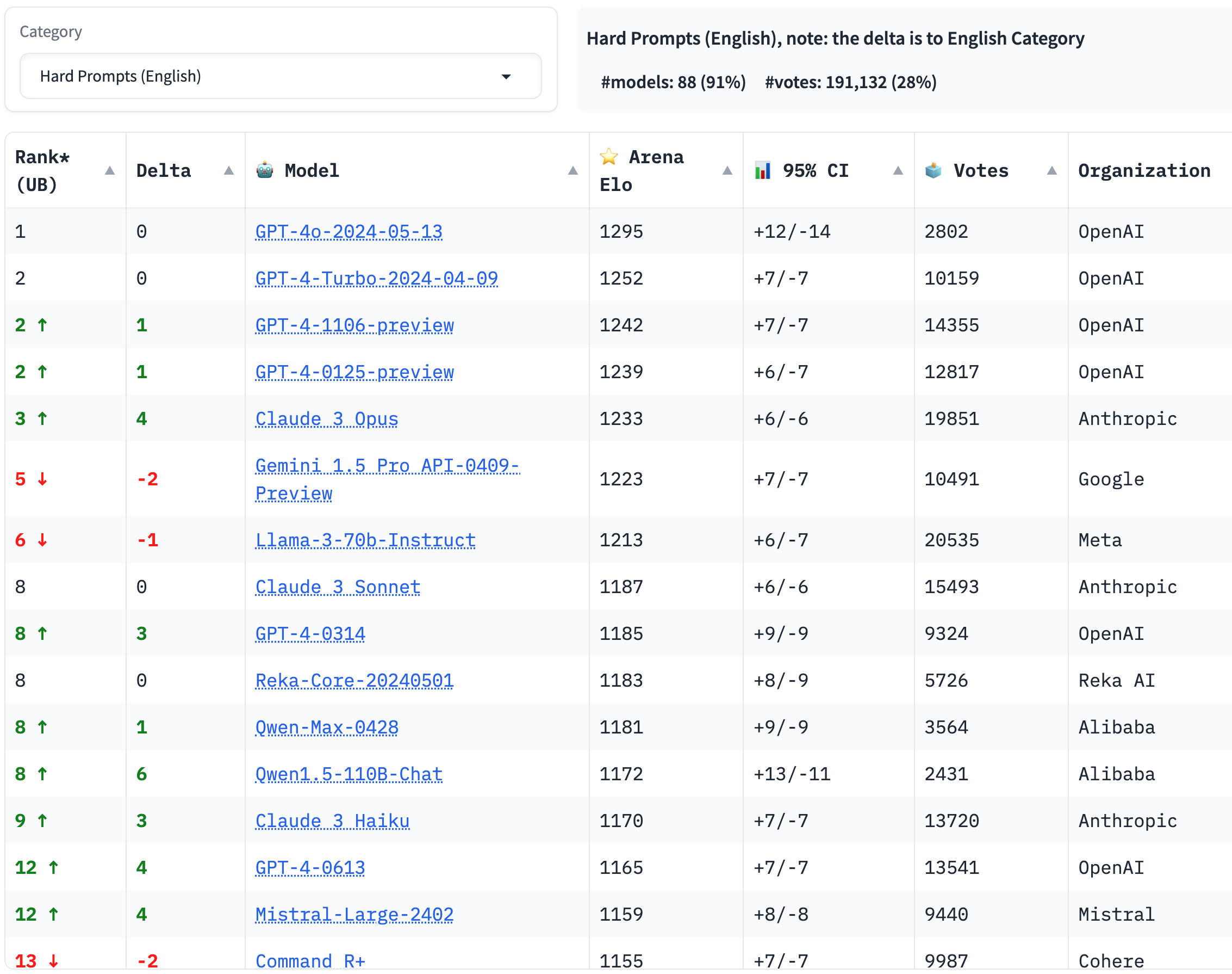 Figure 5. The leaderboard for Hard Prompts (English) category as of May 17, 2024.