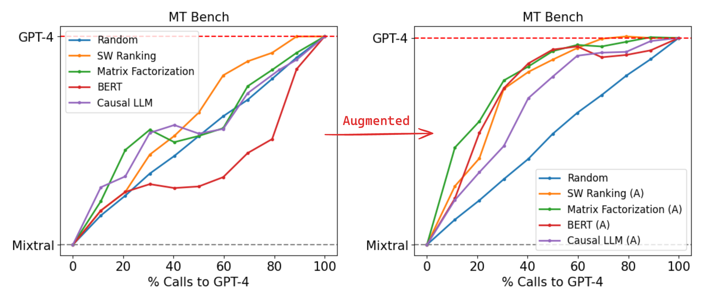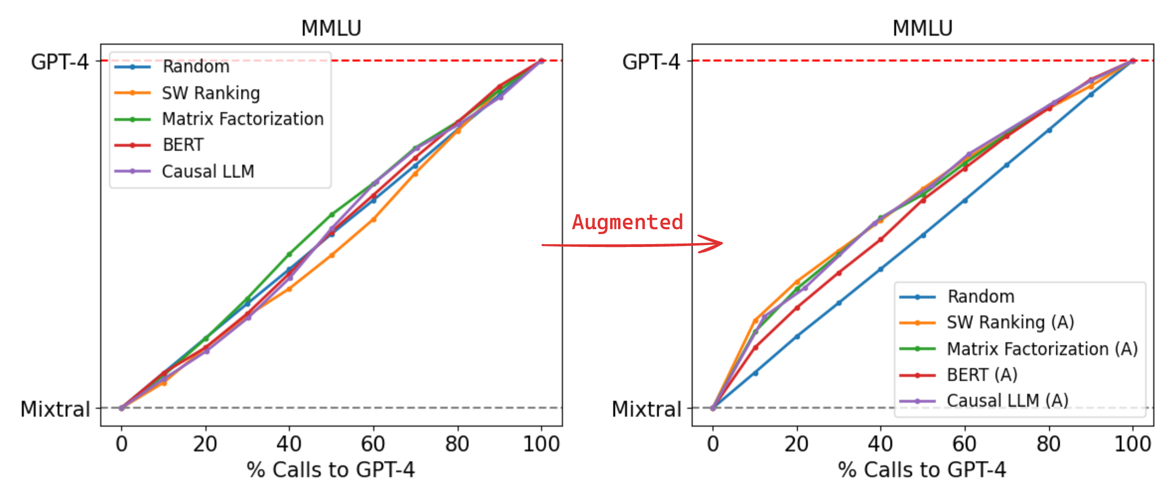 Conversely, on MMLU in Figure 4, all routers perform poorly at a near-random level when trained only on the Arena dataset, which we attribute to most MMLU questions being out-of-distribution. However, augmenting the training dataset using golden-label data from the MMLU validation split leads to significant performance improvements across all routers, with our best-performing causal LLM router now requiring only 54% GPT-4 calls to achieve 95% of GPT-4 performance, 14% cheaper than the random baseline. Importantly, this augmented dataset of approximately 1500 samples represents less than 2% of the overall training data, demonstrating the effectiveness of data augmentation even when the number of samples is small.