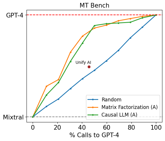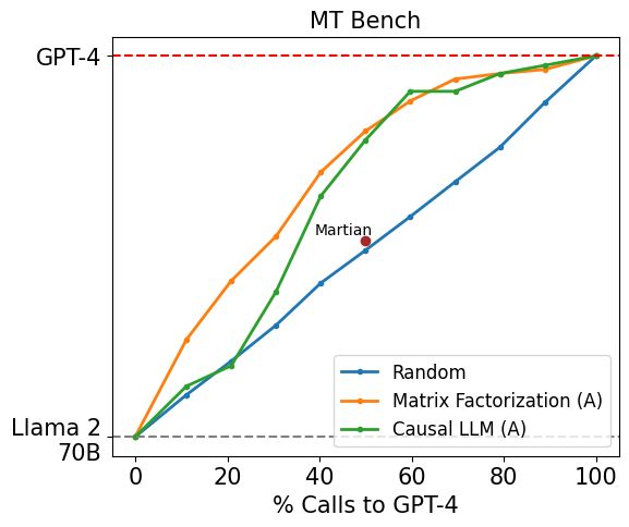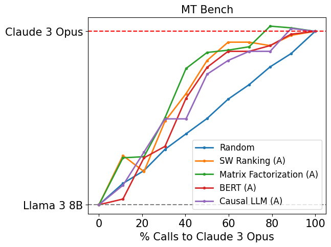 Figure 3 displays the performance of our routers on MT Bench. For routers trained only on the Arena dataset, we observe strong performance for both matrix factorization and SW ranking. Notably, matrix factorization is able to achieve 95% of GPT-4 performance using 26% GPT-4 calls, which is approximately 48% cheaper as compared to the random baseline.