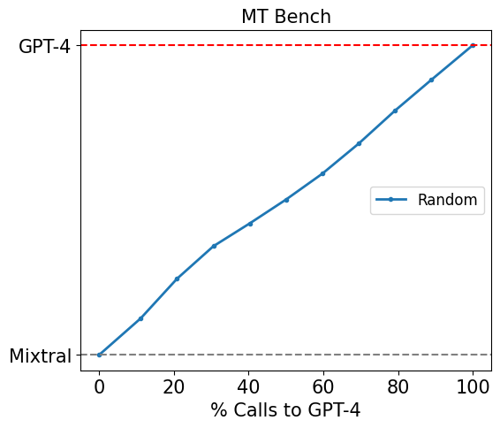 This is best understood through Figure 2, which represents the performance of a router that randomly routes between the two models on MT Bench. Specifically, we route between GPT-4 and Mixtral 8x7B here, with their performance denoted by the red and grey dotted lines respectively. For any router, we can plot a similar graph of its performance against the number of the calls made to GPT-4 (which is representative of the cost incurred since the cost of a Mixtral call is negligible).