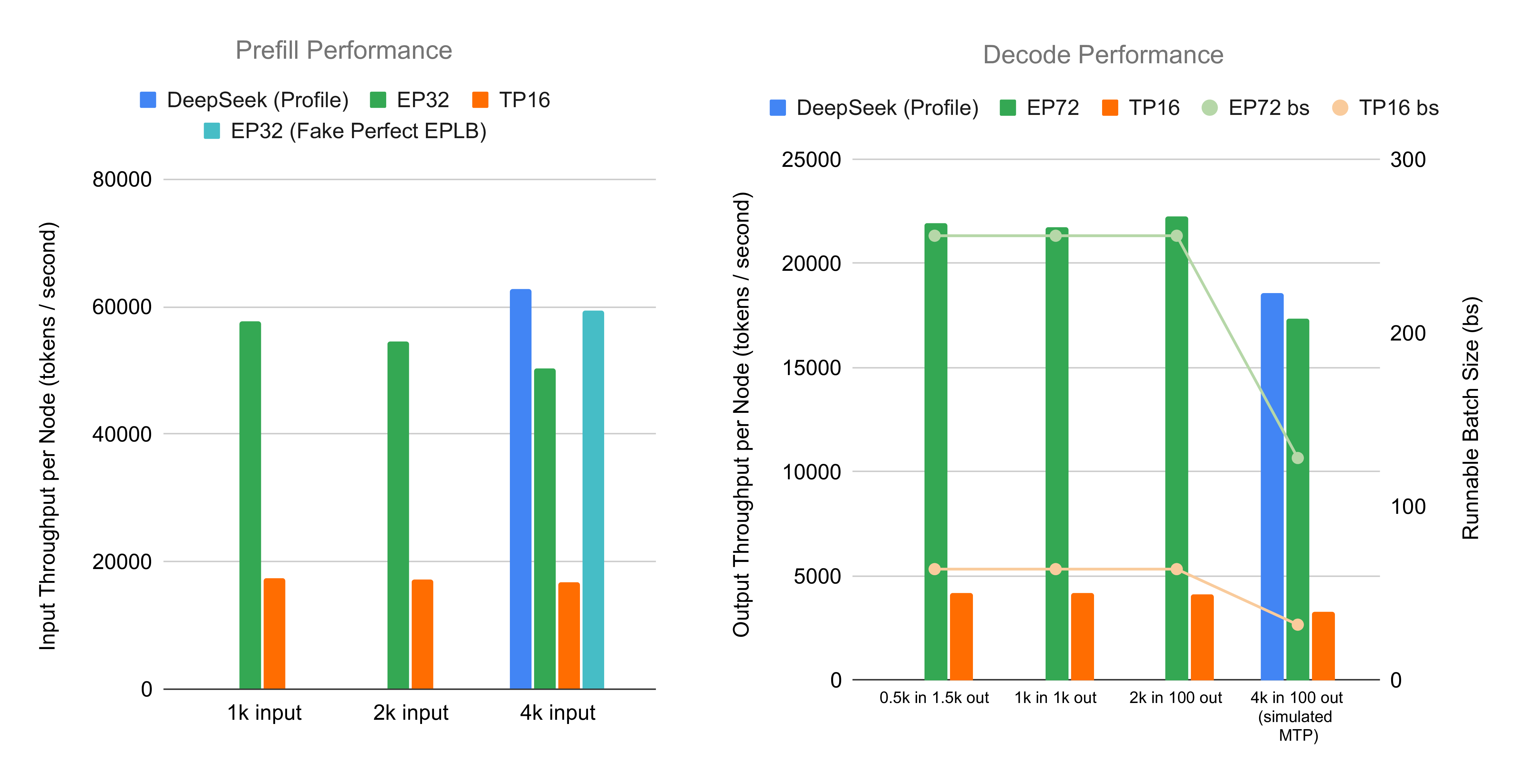 - Decode Phase: Evaluated on 9 nodes (9×8×H100, EP72; half the scale of DeepSeek), the system achieved 22,282 tokens/sec per node for 2K inputs—representing a 5.2× speedup over the TP16 baseline. Under simulated MTP conditions—with attention kernels intentionally slowed to reflect real-world latency—the system sustained a high throughput of 17,373 tokens/sec per node for 4K inputs, just 6.6% below DeepSeek’s official profile. As shown in the figure on the right, these performance gains are largely attributed to 4× larger batch sizes enabled by EP, which enhances scalability by significantly reducing per-GPU memory consumption of model weights.