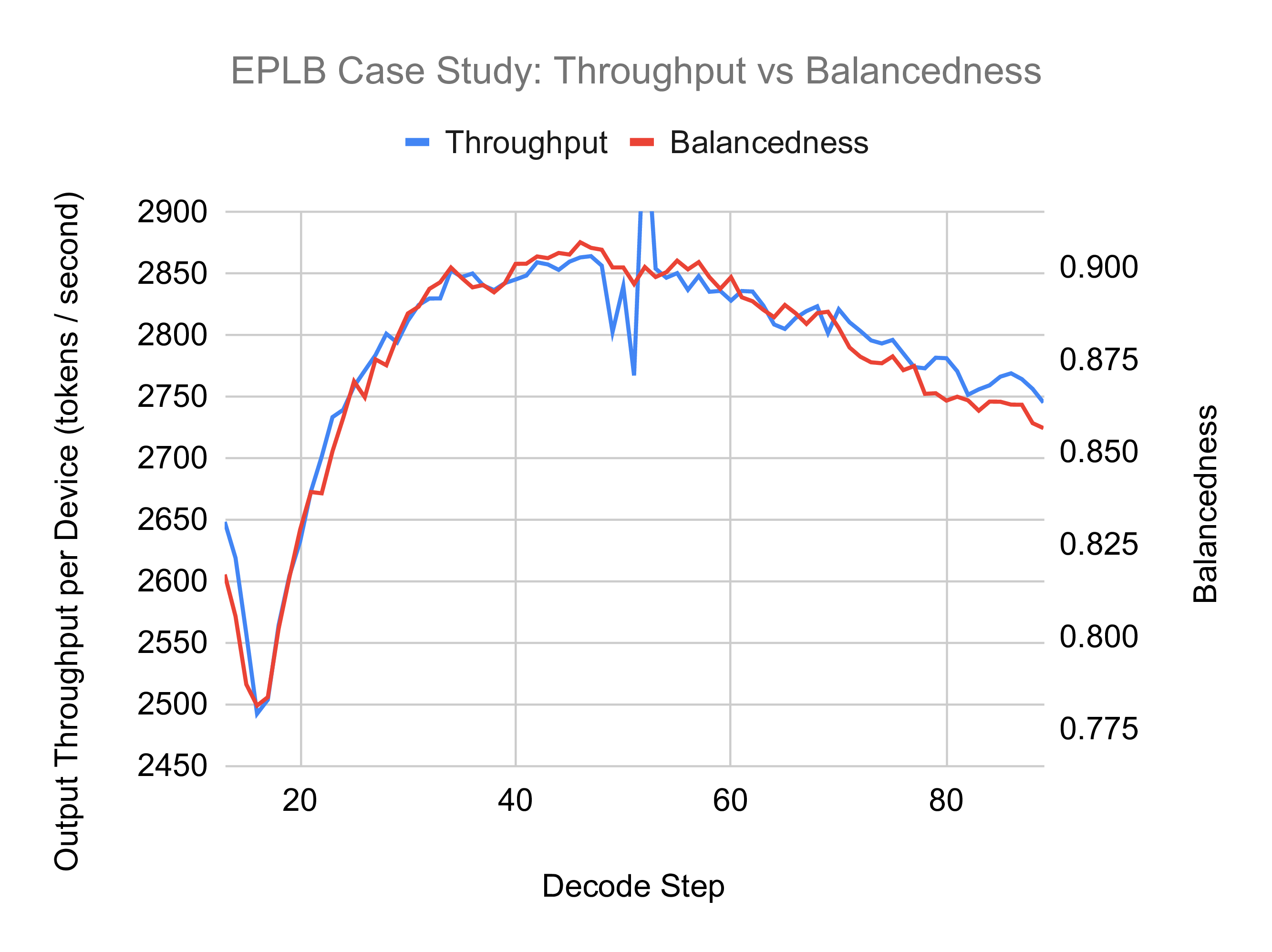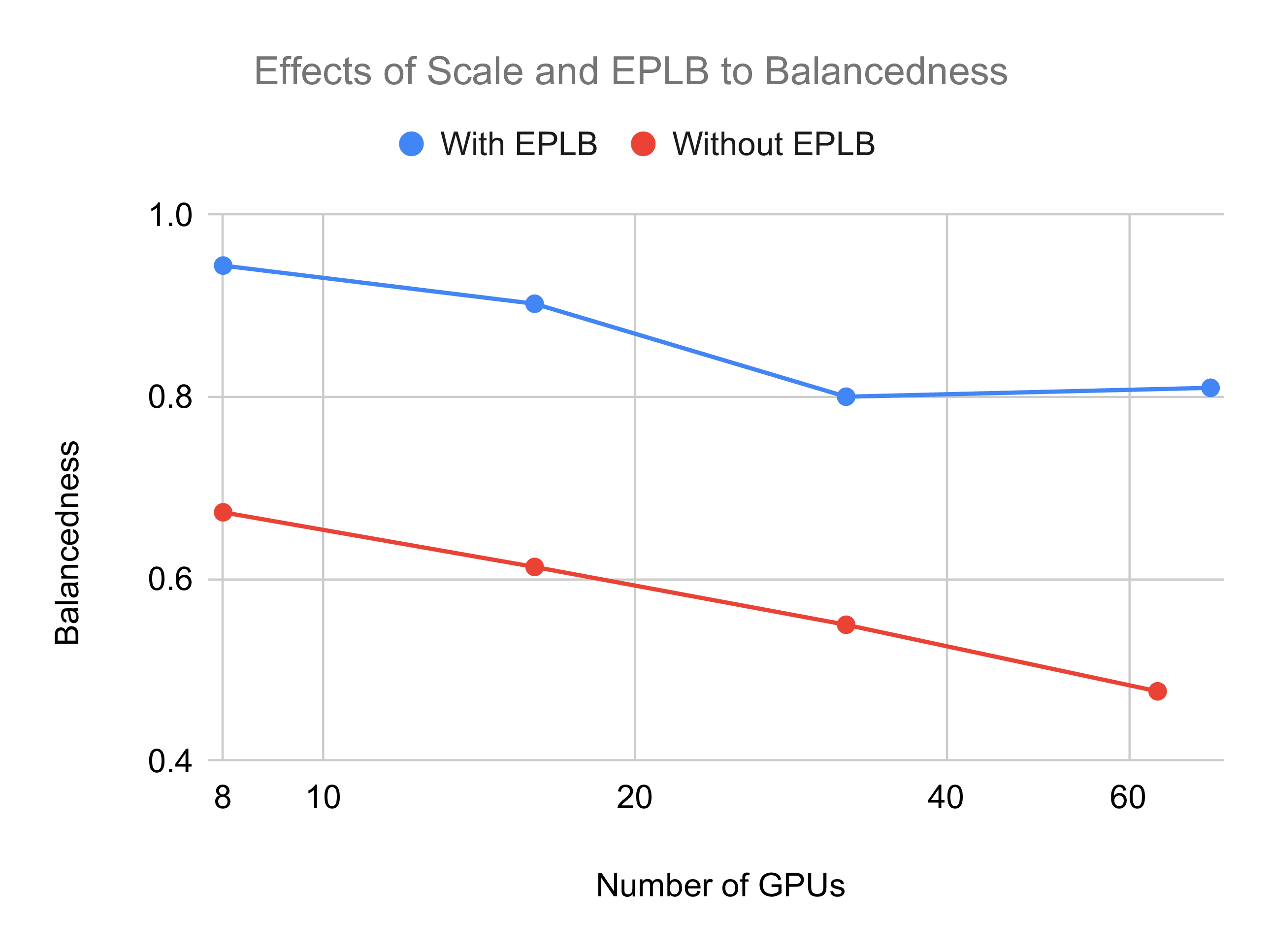 Beyond balancing workloads, EPLB offers greater flexibility in parallelism design. With the original 256 experts, parallelism sizes are restricted to powers of two. EPLB’s use of 288 experts enables more diverse configurations, such as parallelism sizes of 12 or 72.