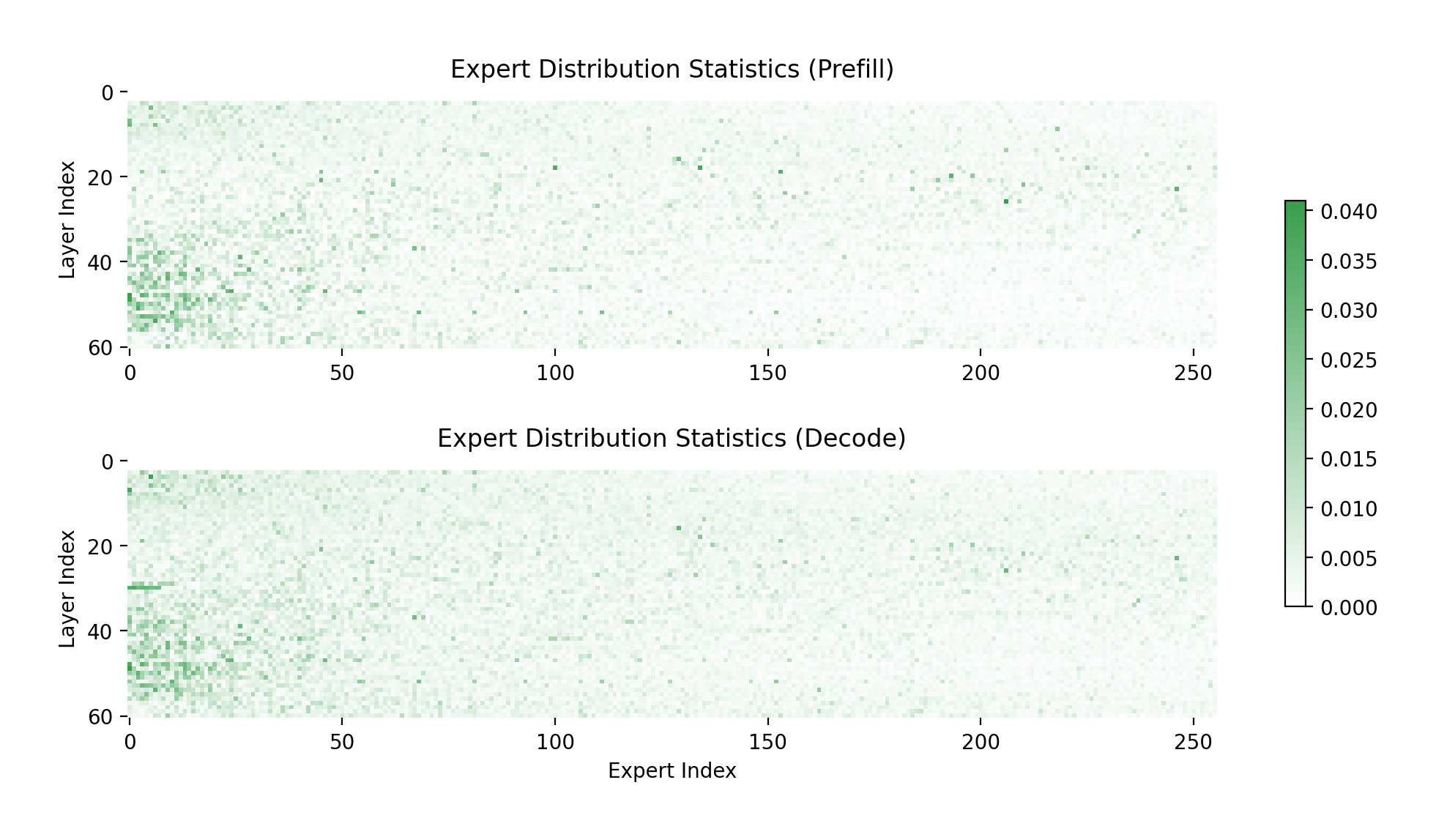 The following figure presents expert distribution statistics for prefill and decode sample data: