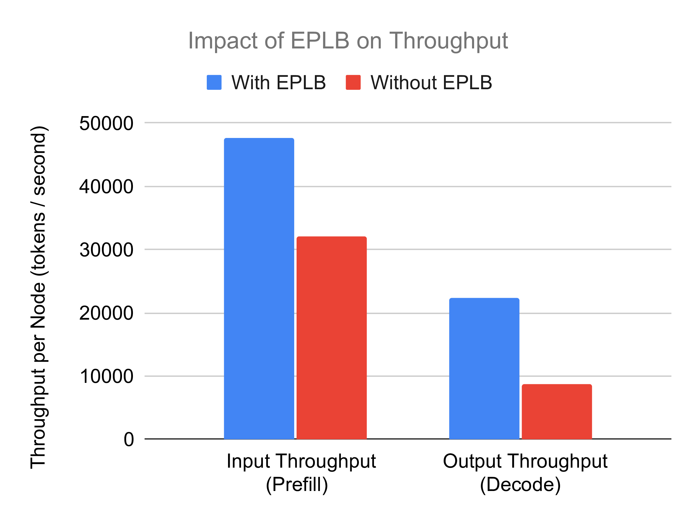 The figure below illustrates EPLB's effect on throughput in large-scale settings. EPLB delivers a significant speedup of 1.49x (prefill) and 2.54x (decode), as expected, due to its ability to mitigate workload imbalances across GPUs. As the number of ranks scales, imbalances grow, and EPLB effectively addresses this in our large-scale experiments, leading to notable throughput improvements.