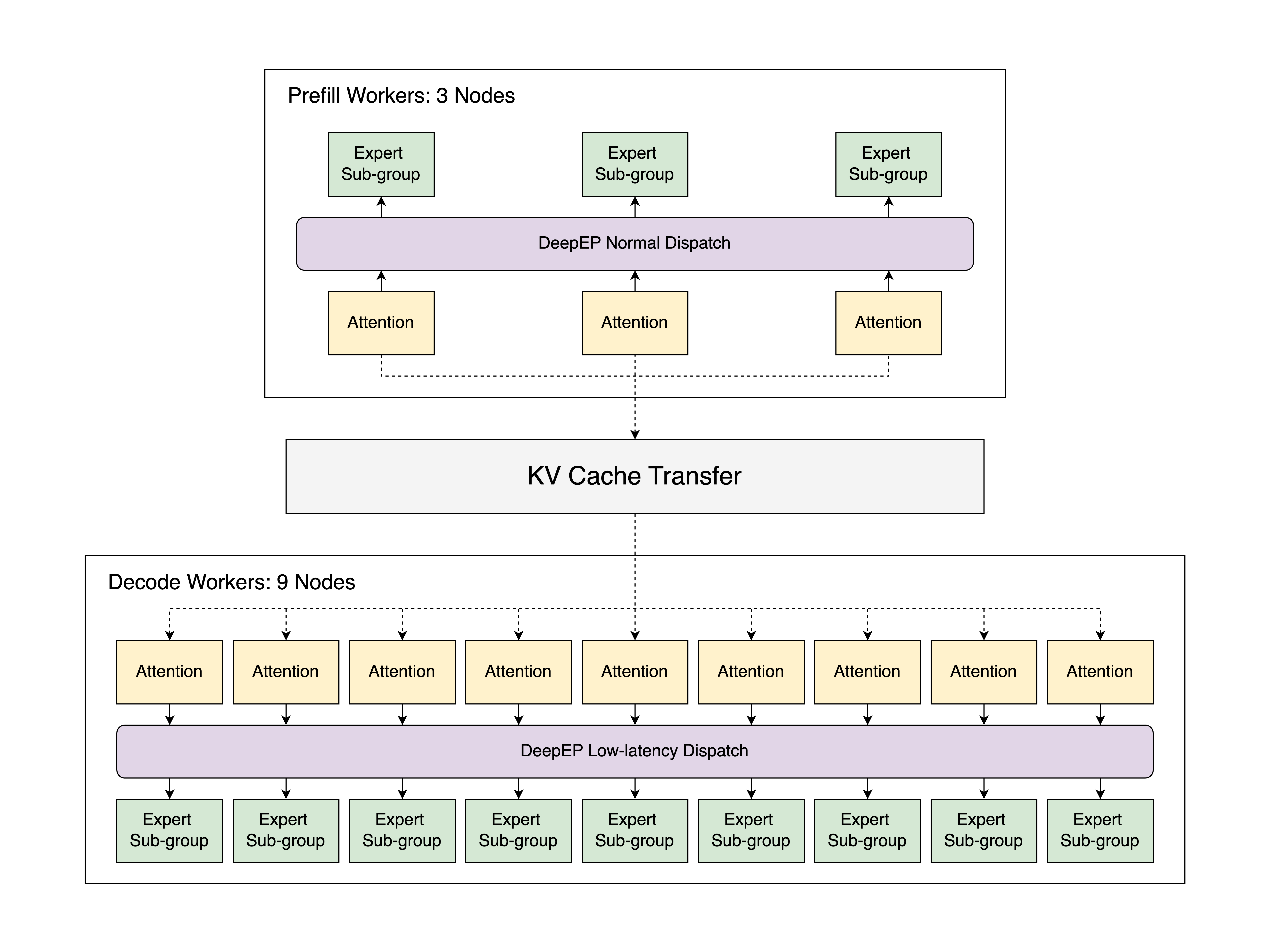 Our implementation, shown in the figure above, runs on 12 nodes in the Atlas Cloud, each equipped with 8 H100 GPUs. It uses prefill-decode disaggregation and large-scale expert parallelism (EP), achieving a speed of 52.3k input tokens per second and 22.3k output tokens per second per node for 2000-token input sequences. To the best of our knowledge, this represents the first open-source implementation to nearly match the throughput reported in the official DeepSeek blog at large scale. By deploying this implementation locally, it translates to a cost of $0.20/1M output tokens, which is about one-fifth the cost of the official DeepSeek Chat API. Compared to vanilla tensor parallelism using the same resources, this optimized strategy improves the output throuhgput by up to 5x. This blog dives into our parallelism design, optimization methods, and results. All components of our work are fully open-source, allowing others to explore and build on our efforts. The instructions for reproducing our experiments are fully available here.