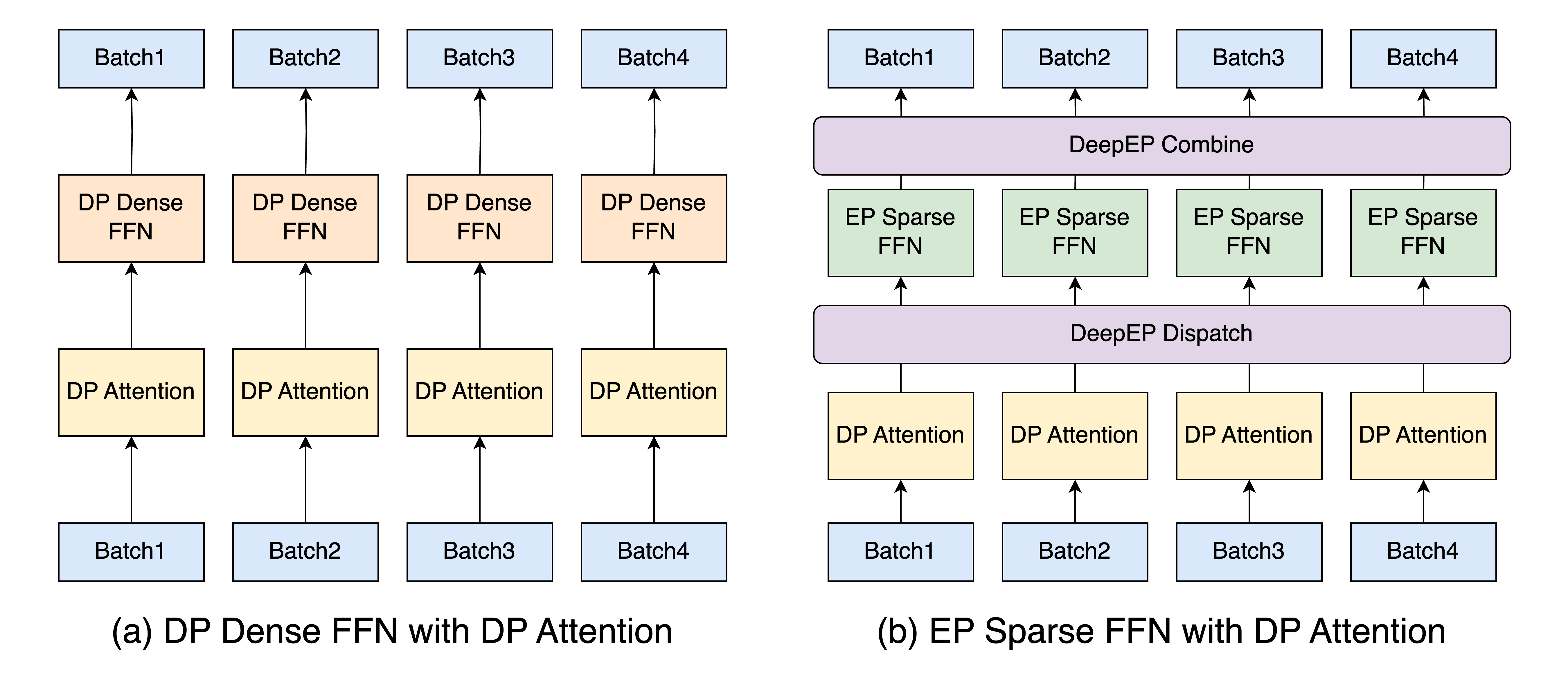 The integration of DP dense FFN with DP attention is illustrated in the left figure below. Users can enable this feature by setting --moe-dense-tp-size=1.
