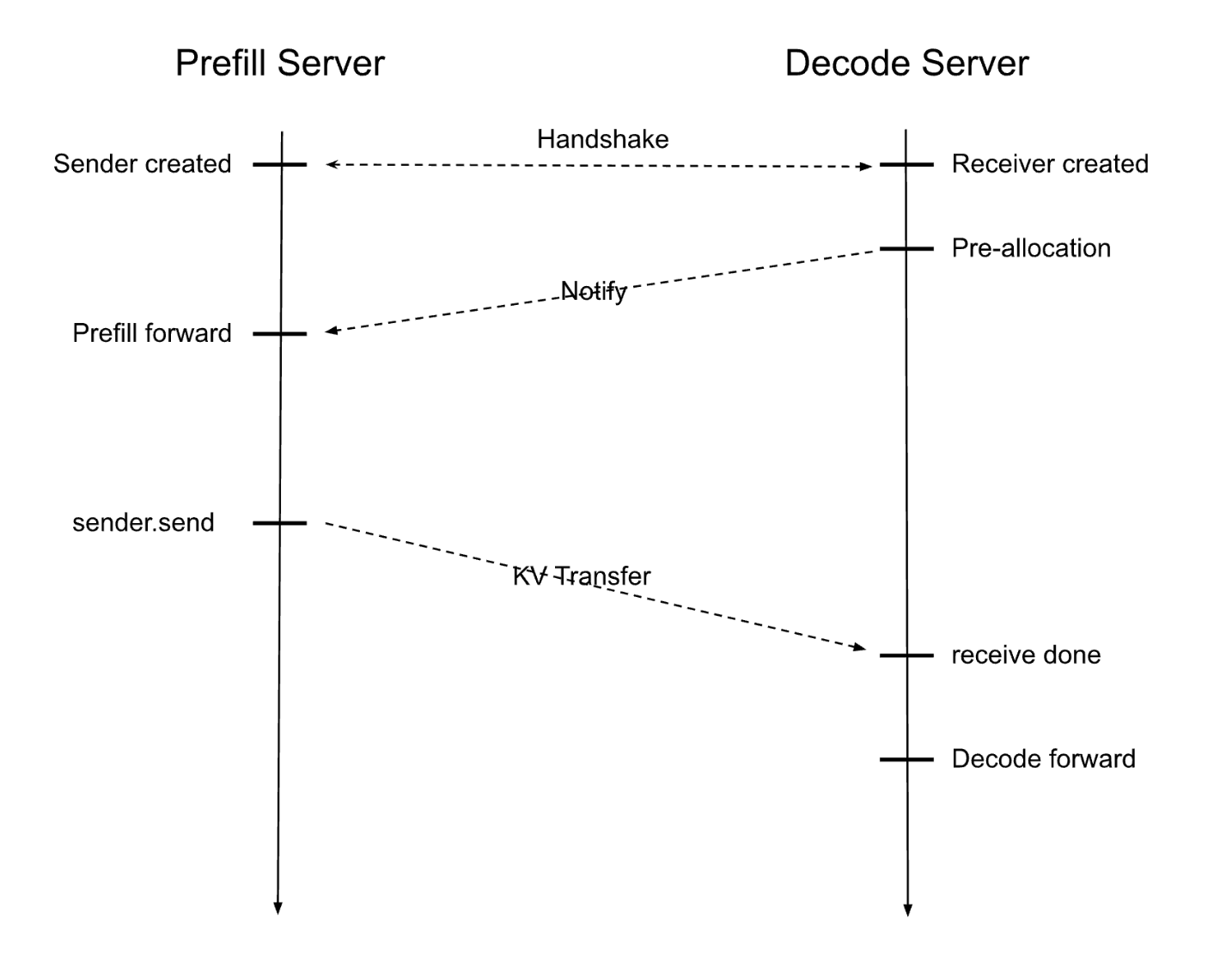 - A Prefill Server and a Decode Server pair via a handshake, establishing a local sender and receiver, respectively.