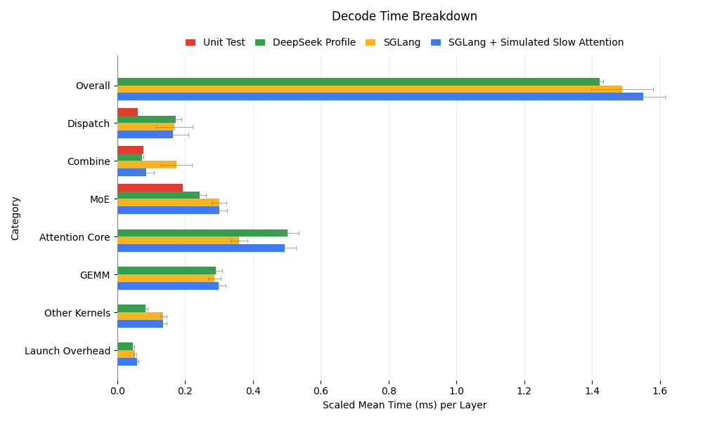 SGLang’s decode kernel breakdown aligns closely with DeepSeek’s, as shown below: