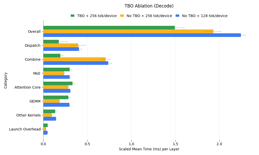 - TBO (256) vs. No-TBO (128): Comparing cases with the same kernel batch size, only non-overlapped communication slows down in the no-TBO setup, while computation remains consistent. Unlike prefill, decode communication kernels either fully utilize SMs (during send/receive) or none (during inflight waiting), avoiding resource contention with computation kernels.