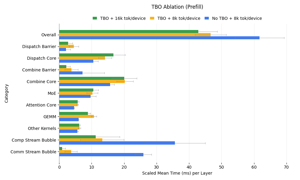 - Batch Size Impact: Reducing the batch size from 16k to 8k with TBO results in a slight slowdown, reflecting diminished kernel efficiency with smaller batches.