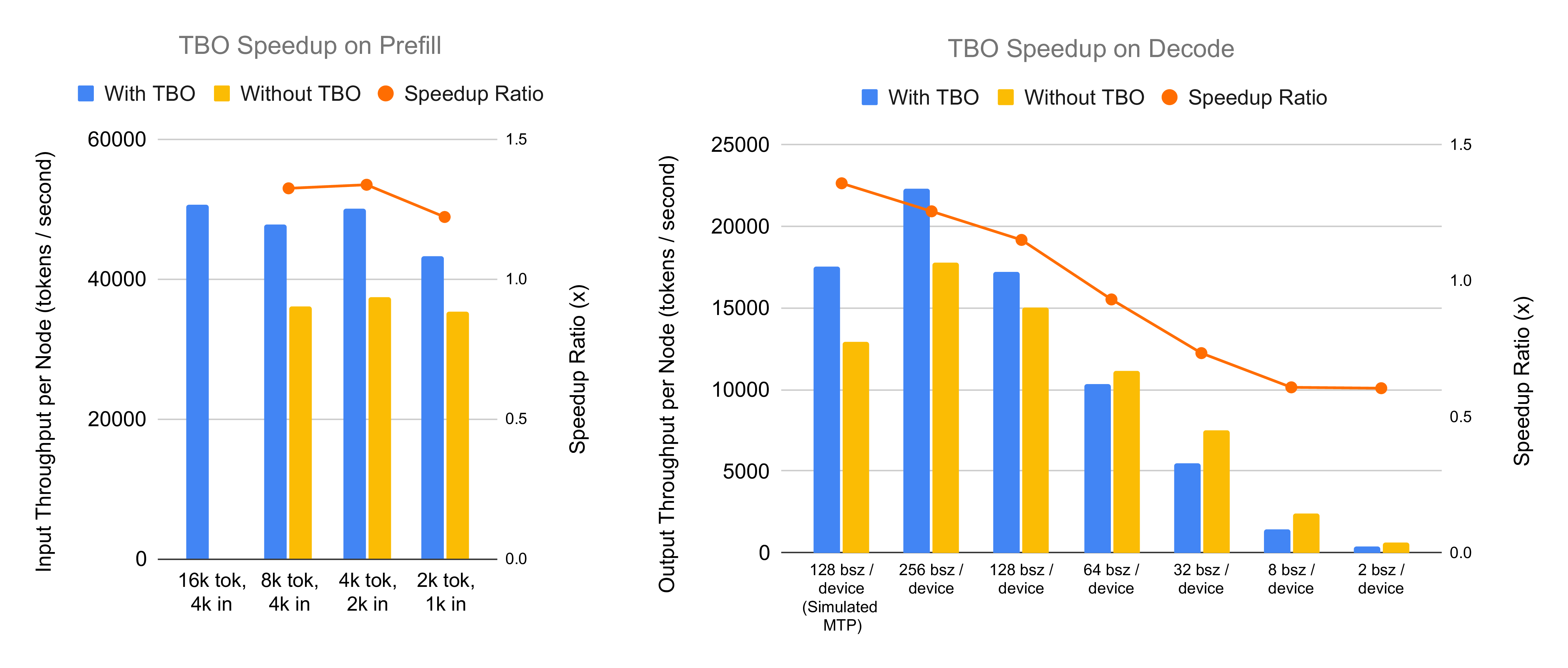 - Simulated MTP Scenario: TBO provides the most substantial speedup in simulated MTP cases when processing 128 requests to generate 256 tokens per decode step. This is due to prolonged attention processing time, which aligns computation (e.g., DP Attention layers) with DeepEP communication overhead (e.g., combine and dispatch steps). The evaluation shows a 35% speedup at 128 sequences/device, with throughput 17,552 tokens per second compared to 12,929 without TBO.