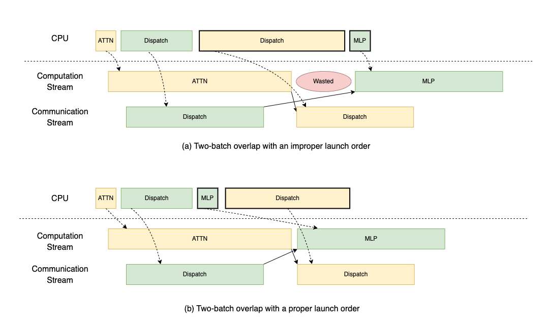 We refine the launch order during the prefill phase to avoid CPU-blocking via the dispatch operation in DeepEP, even though we are using its asynchronous mode. Specifically: