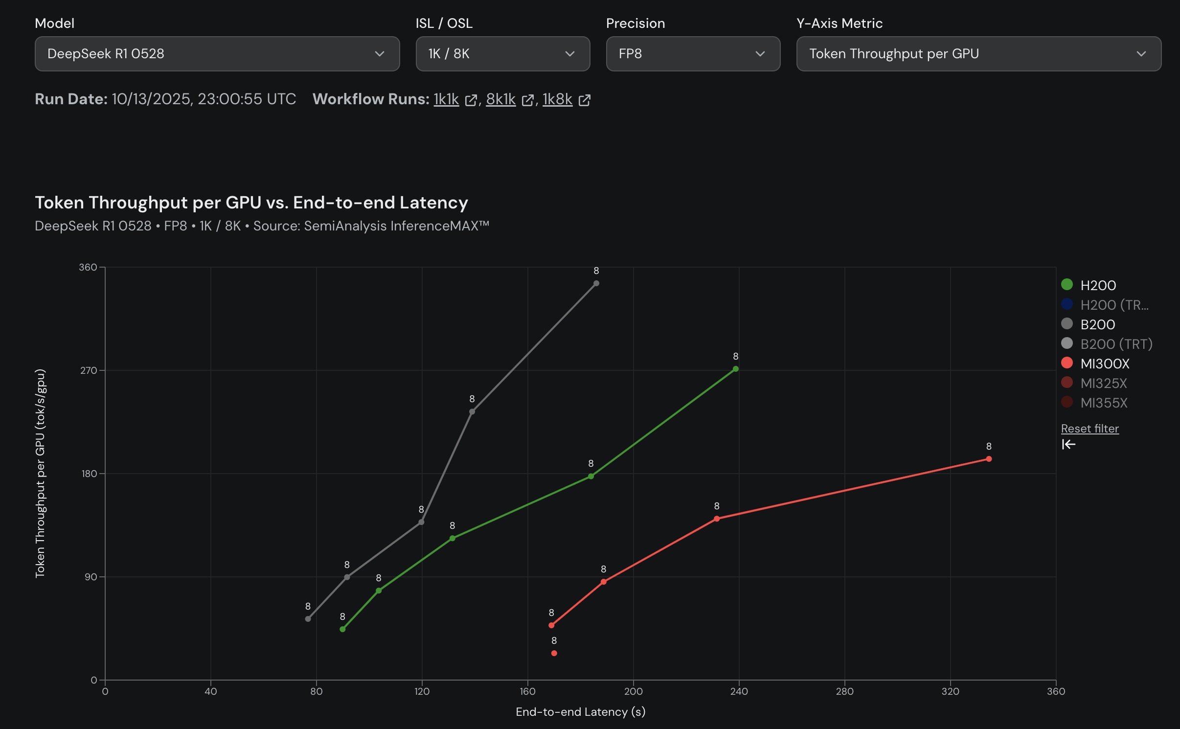 LLM inference performance is driven by two pillars: hardware and software. While hardware innovation drives step-function improvements, software evolves daily, delivering continuous performance gains. The SemiAnalysis InferenceMAX™ benchmark was designed to capture this dynamic. It runs a suite of benchmarks every night on hundreds of chips, continually re-evaluating the world’s most popular open-source inference frameworks and models to track real performance in real-time. A live dashboard is available to the public at inferencemax.ai.