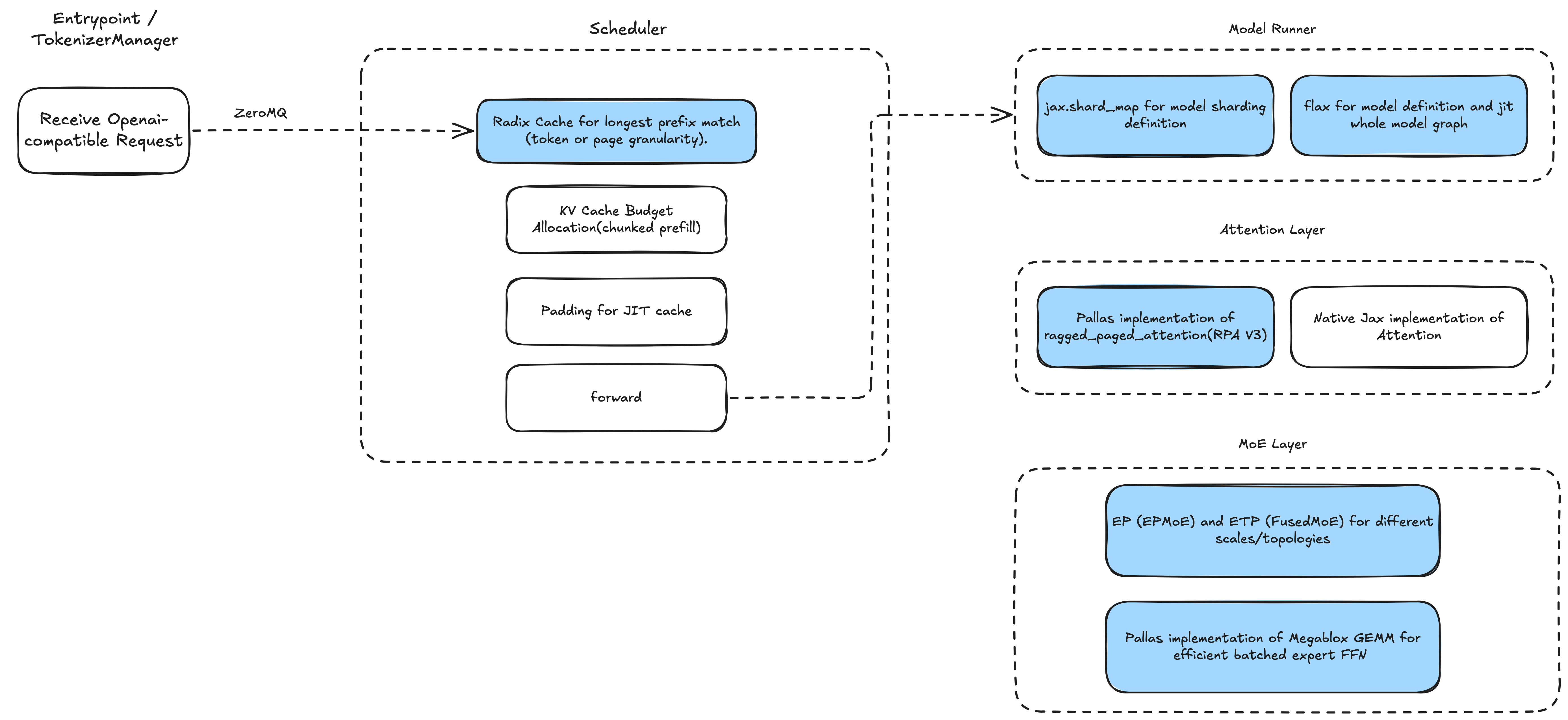 The diagram below illustrates the SGLang-Jax architecture. The entire stack is pure Jax, resulting in clean code with minimal dependencies.