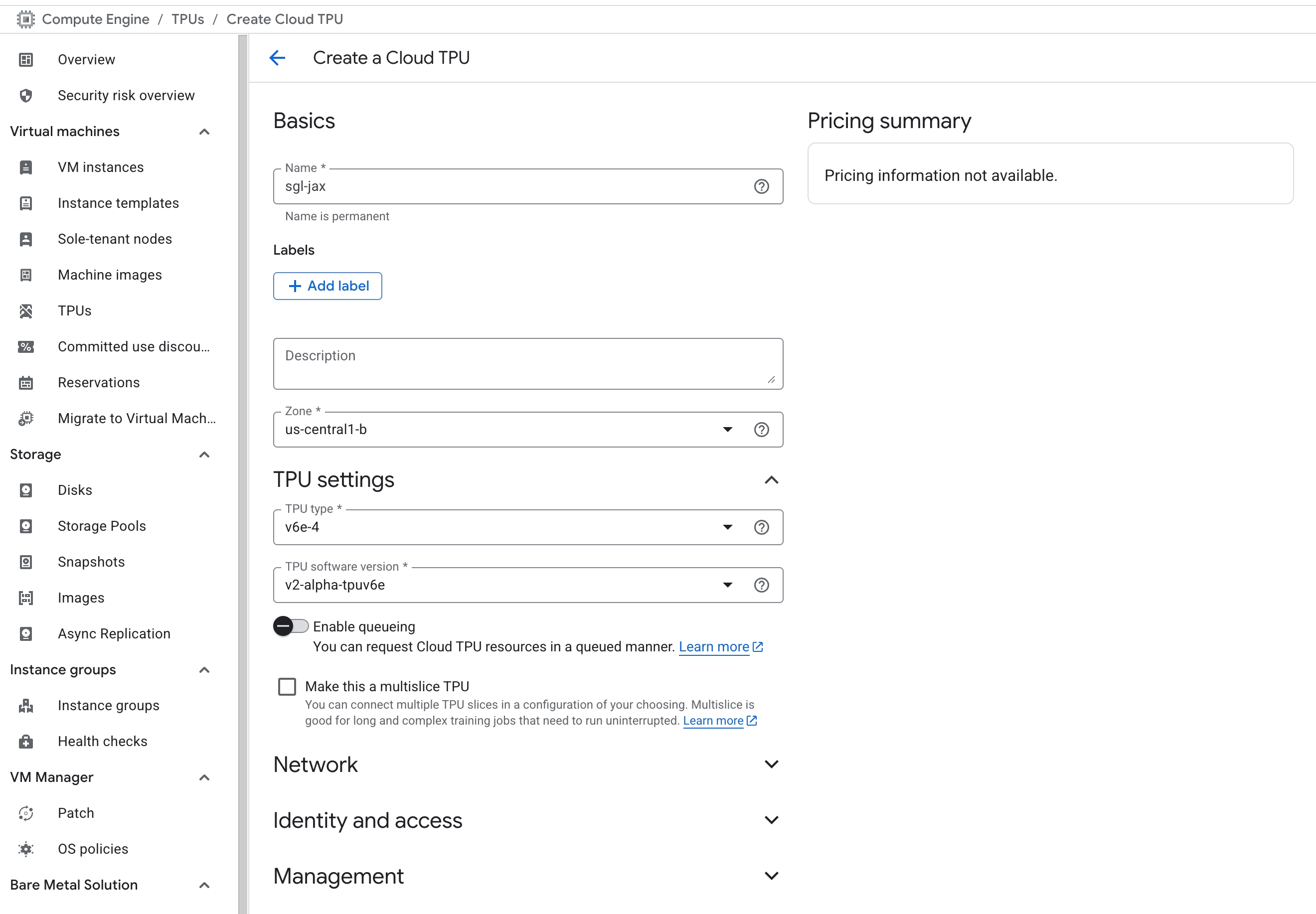 Note: Only certain zones support specific TPU versions. Remember to set the TPU software version to v2-alpha-tpuv6e.