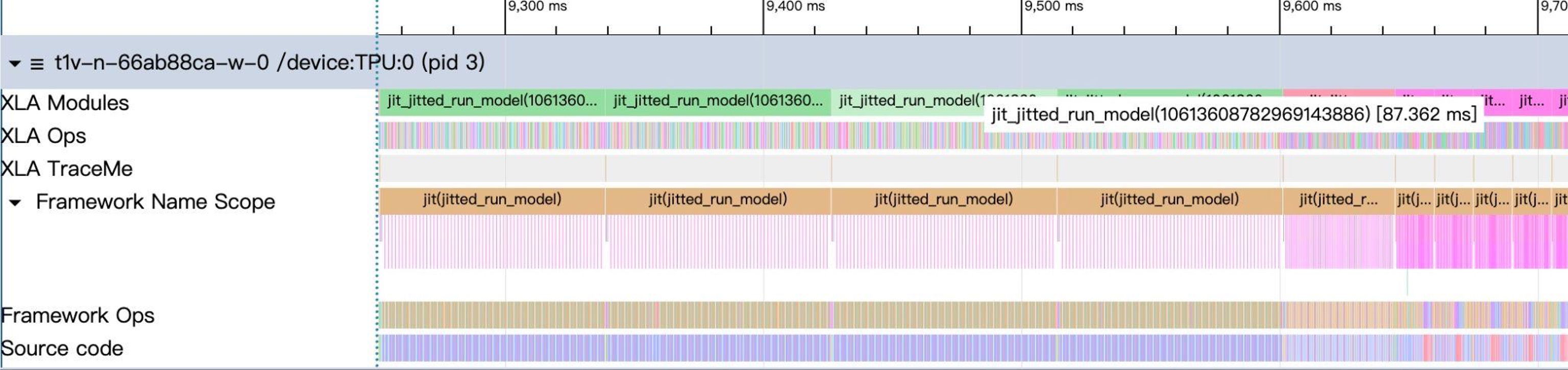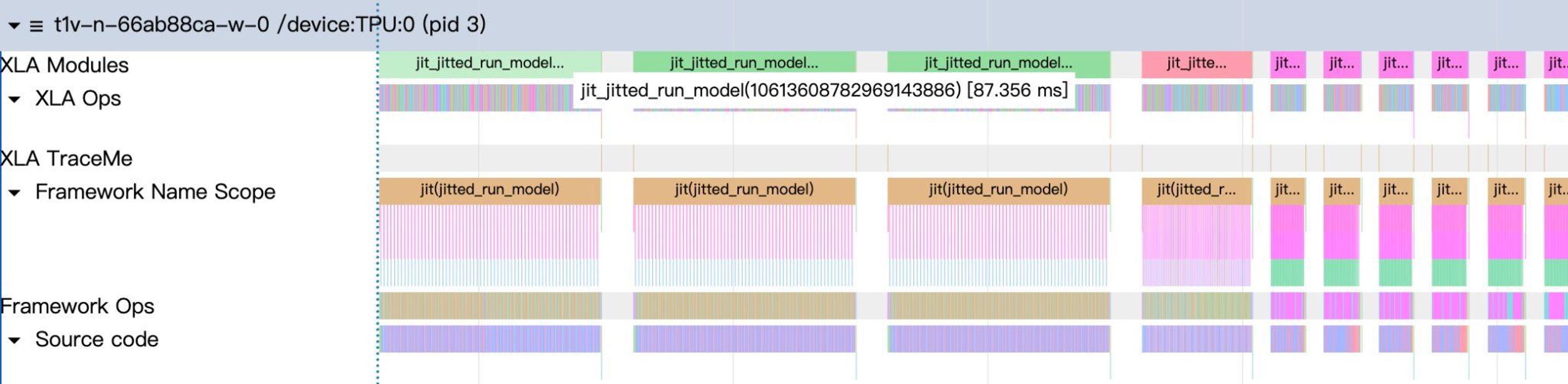 In the overlap event loop, the scheduler uses a result queue and threading events to pipeline CPU and TPU work. While the TPU processes batch N, the CPU prepares batch N+1. To maximize overlap between CPU and TPU, SGLang-jax carefully sequences operations based on profiling results. For Qwen/Qwen3-32B, we reduced the time gap between prefilling and decoding from approximately 12ms to 38us, and from approximately 7ms to 24us. More details can be found in our previous blog.