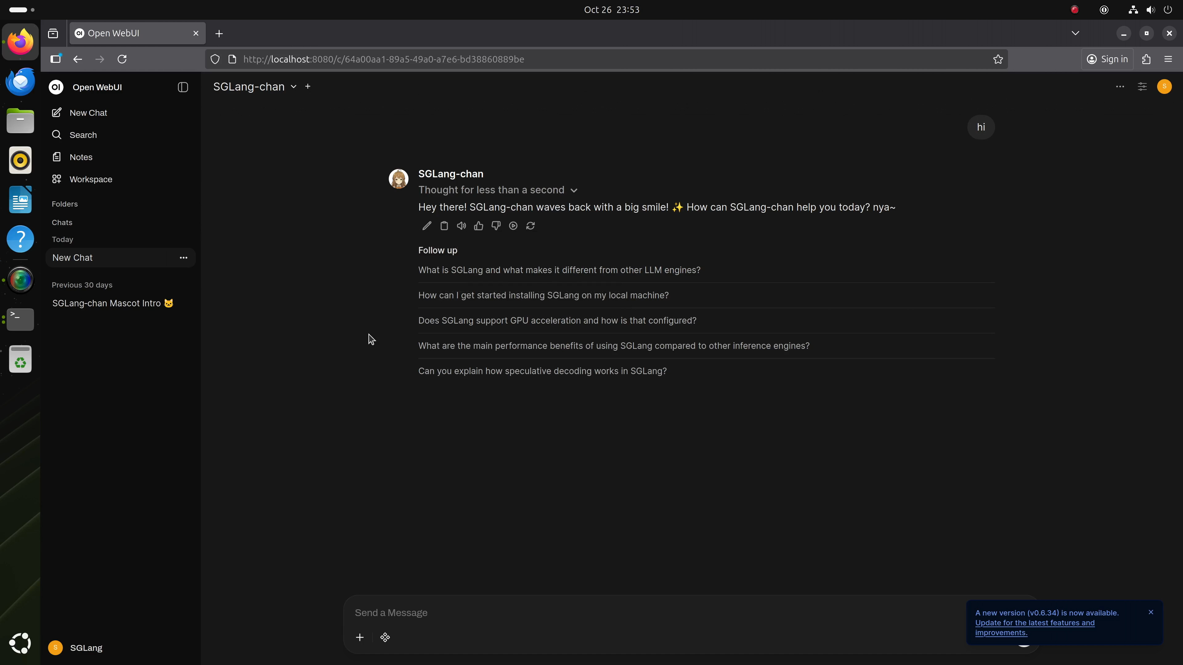 To set up a friendly local chat interface, you can install Open WebUI on your DGX Spark and point it to your running SGLang backend: http://localhost:30000/v1. Follow the Open WebUI installation instructions to get it up and running. Once connected, you’ll be able to chat seamlessly with your local GPT-OSS instance. No internet required.