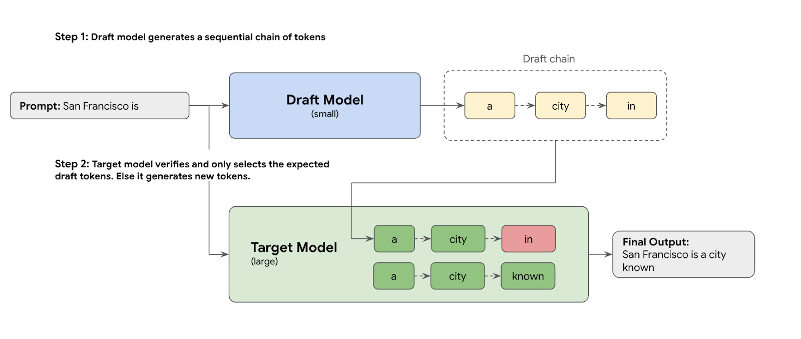 This draft mechanism rapidly proposes several next tokens at once. The large target model then verifies these proposals in a single, parallel batch. It accepts the longest matching prefix from its own predictions and continues generation from that new point.