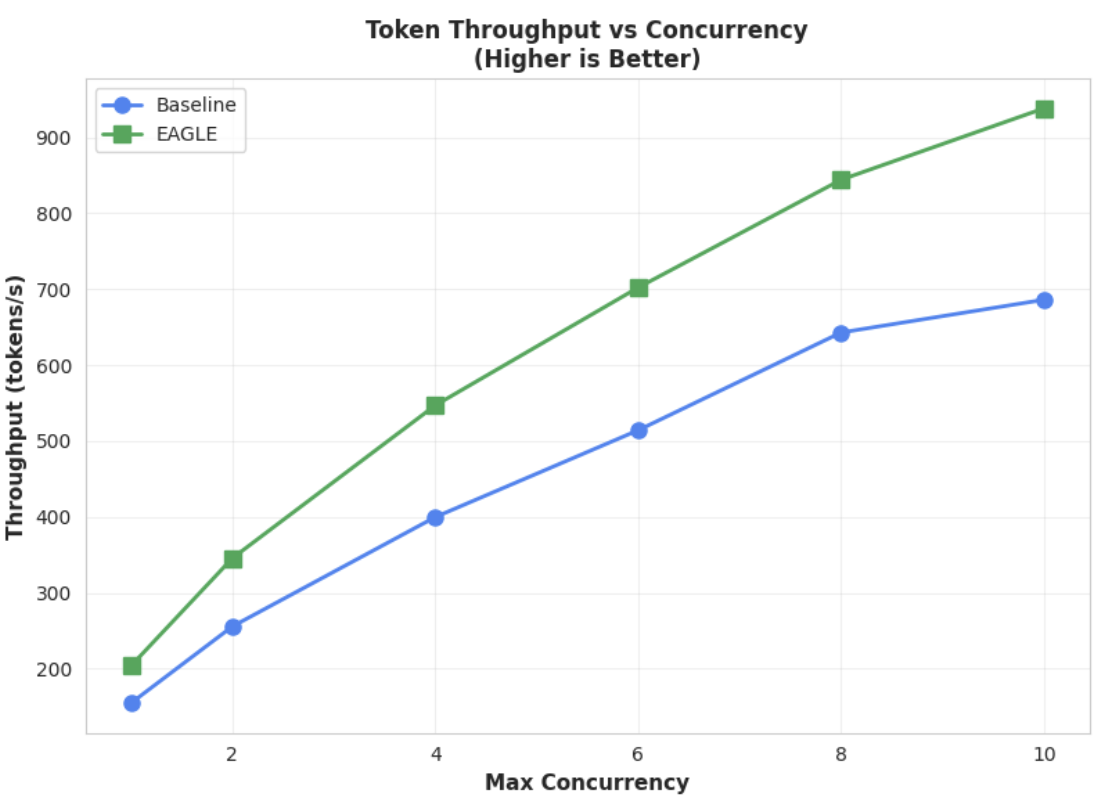 This chart further highlights EAGLE-3's throughput advantage. The Token Throughput vs. Concurrency chart clearly demonstrates that the EAGLE-3-accelerated model (green line) consistently and substantially outperforms the baseline model (blue line).