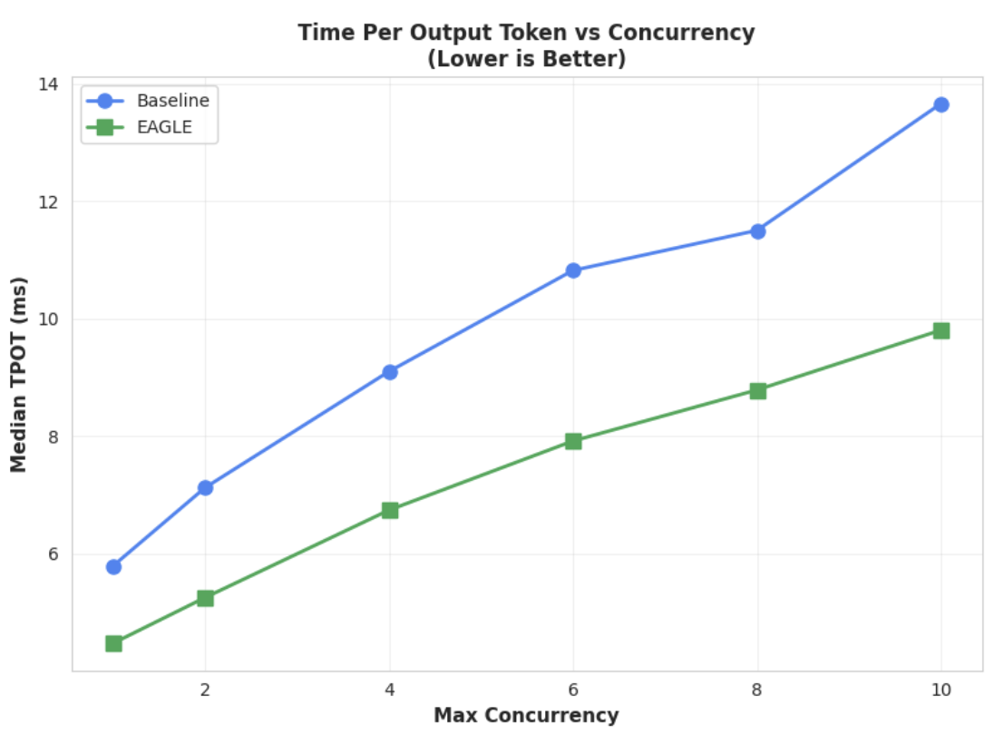 This chart shows the better latency performance of EAGLE-3. The Time Per Output Token (TPOT) chart shows EAGLE-3-accelerated model (green line) consistently achieves a lower (faster) latency than the baseline (blue line) across all tested concurrency levels.