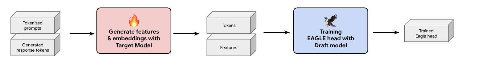 In our case, we chose an offline training approach because it requires much less hardware than online training. This process involves pre-calculating all the features and embeddings before we train the EAGLE-3 head. We save them to GCS and they become the training data for our lightweight EAGLE-3 head. Once you have the data, the training itself is fast. Given the diminutive size of the EAGLE-3 head, initial training with our original dataset required approximately one day on a single host. However, as we've scaled our dataset, training times have commensurately increased, now spanning several days.