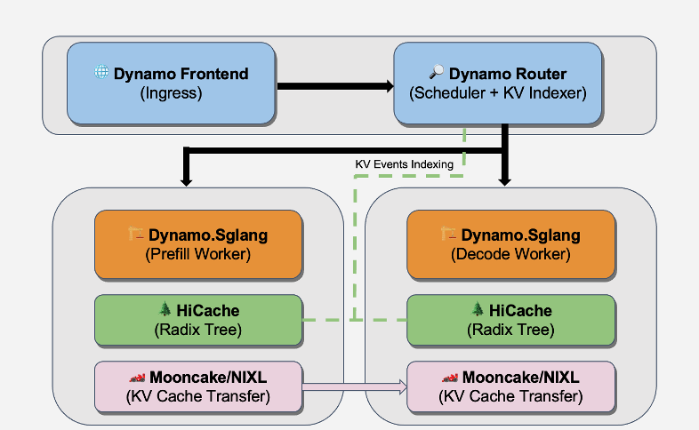 - Low-Overhead Orchestration: Dynamo’s primary performance advantage lies in its lightweight kv-cache aware request steering and efficient metadata management. In long-context scenarios where PD coordination is frequent, Dynamo ensures that the scheduling layer introduces near-zero latency, allowing SGLang’s optimized kernels to saturate the GB300's HBM3e bandwidth without being bottlenecked by orchestration logic.