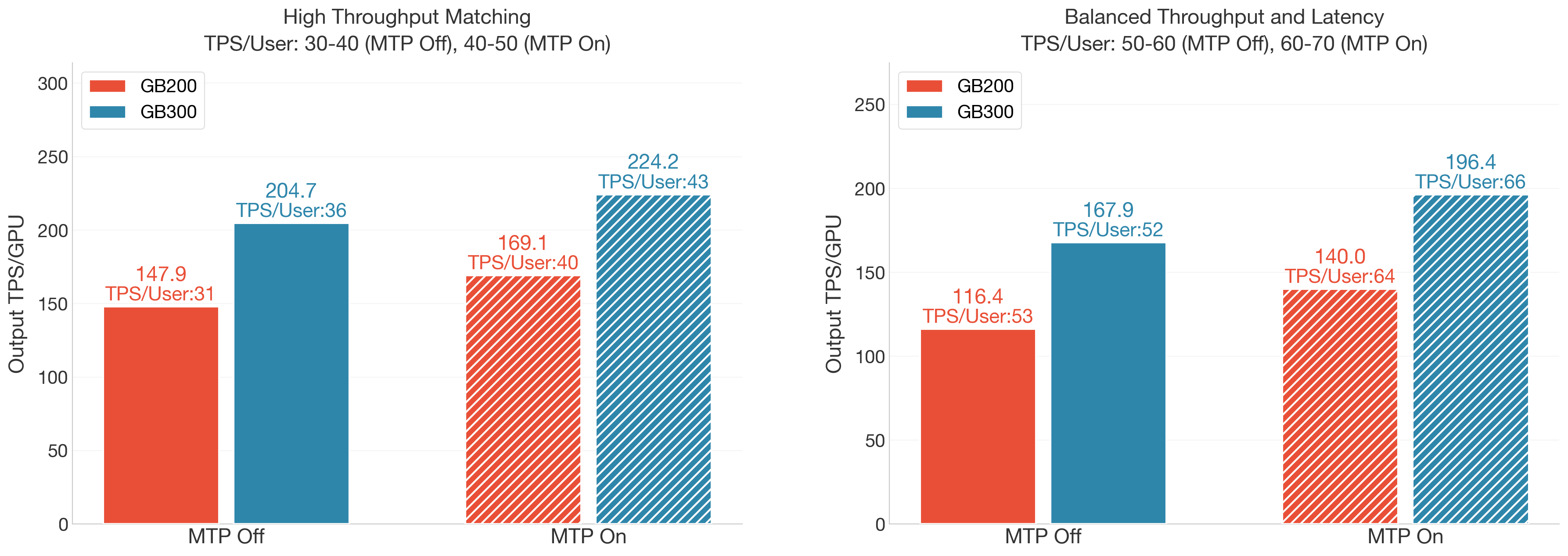 - Latency–throughput balanced scenario (TPS/User = 50–60 for Non-MTP, 60–70 for MTP), which reflects higher per-user throughput and stricter responsiveness requirements.