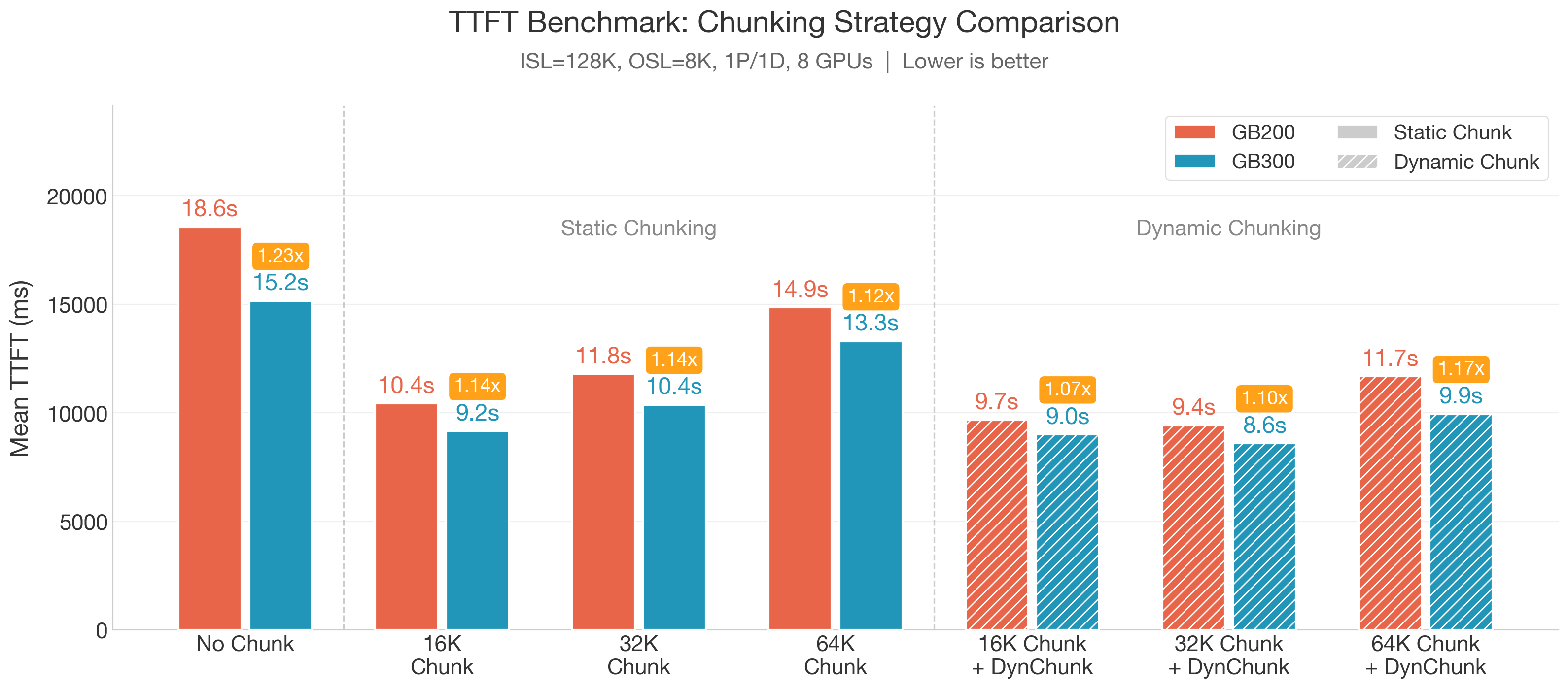 GB300 consistently outperforms GB200 in prefill TTFT. Across all chunking configurations, GB300 achieves 1.07X–1.23X lower TTFT than GB200 under the same settings. The largest gap appears in the no-chunk baseline (15.2s vs. 18.6s), primarily driven by GB300's optimized attention kernel (Section 4.4). With chunking enabled, GB300 maintains a steady advantage, reaching a best-case TTFT of 8.6s for 128K prefill with 32K dynamic chunking.