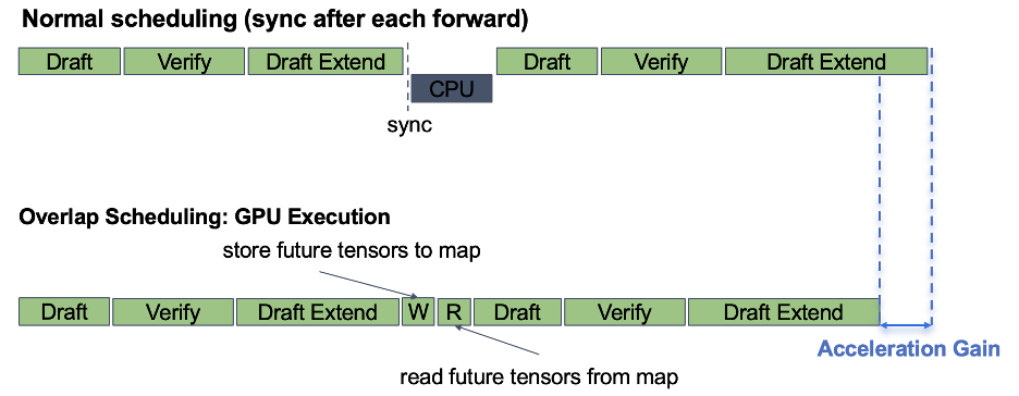 To avoid synchronization barriers caused by transferring metadata tensors from device to host, Spec-V2 creates a future tensor map, where the schedule stream first creates the reference of metadata tensors, and only reads them until the last batch materializes them. In this way, the CPU operations can be overlapped with the target verify or draft extend process of the last MTP batch.