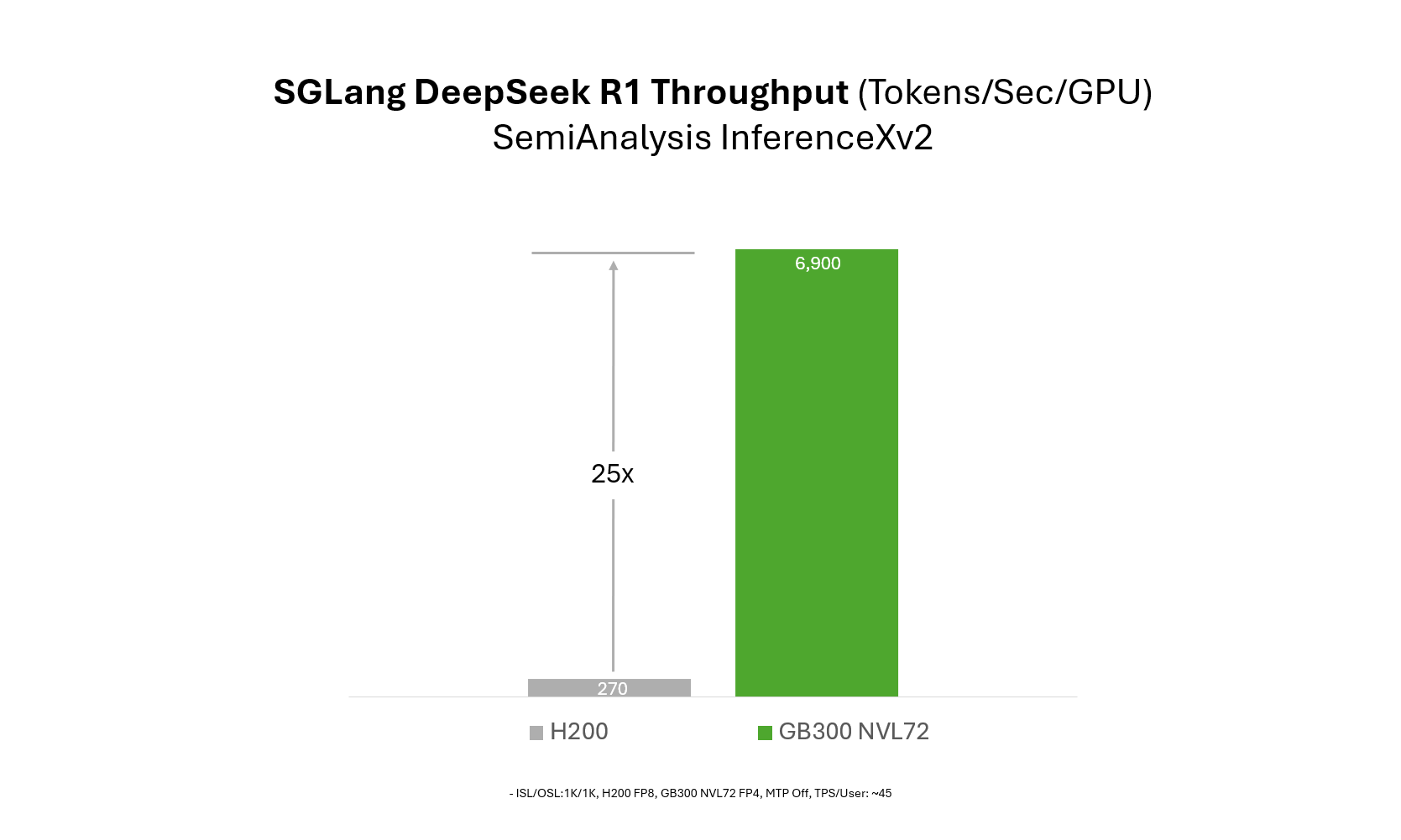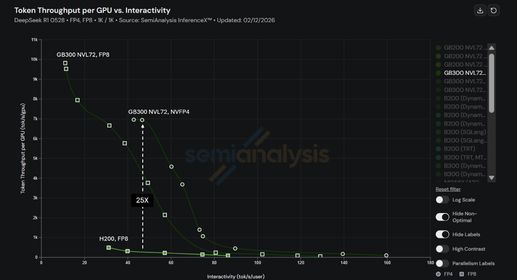 Please note that the H200 baseline used for the 25x improvement is taken at 50 TPS/user interactivity which reflects low latency use cases. In the absence of latency constraint H200 can achieve similar throughput as discussed in this prior blog. We selected 50 TPS/user as the comparison point for this blog to give a scenario where reasonable latency is expected.