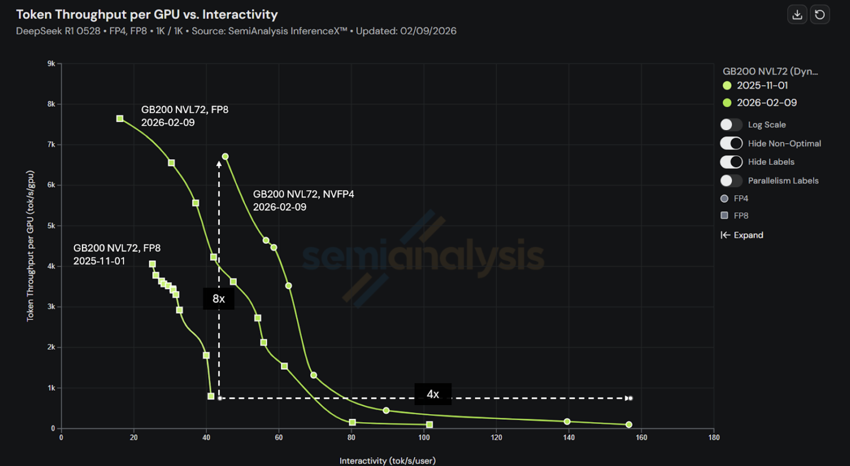 While GB300 NVL72 is our new performance flagship, we remain committed to continuously improving SGLang on GB200 NVL72. Compared to our prior InferenceMAXv1 submission, less than 4 months ago, the latest v2 release with low precision NVFP4 delivers up to 8x more tokens-per-GPU in high throughput regimes and up to 4x more tokens-per-user in high interactivity regimes, enabling better token economics and end-user experience on existing GB200 NVL72 deployments. These results validate the power of the joint NVIDIA and SGLang engineering collaboration.